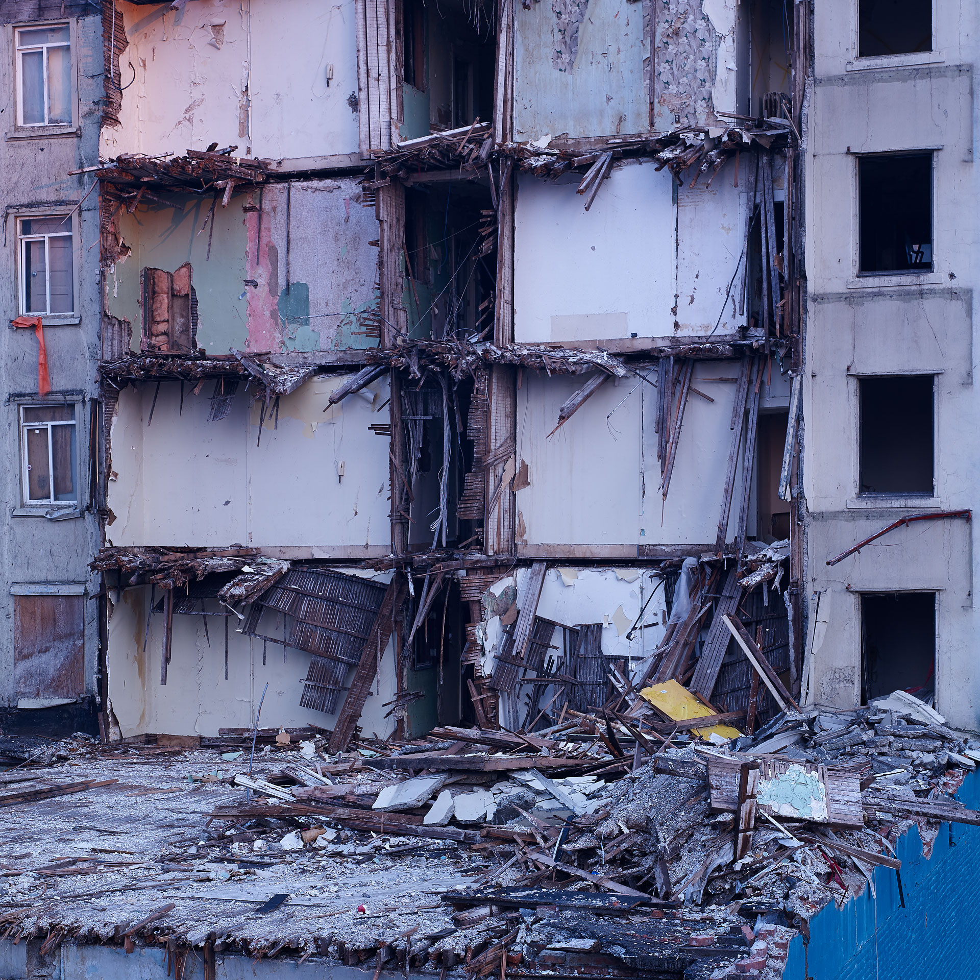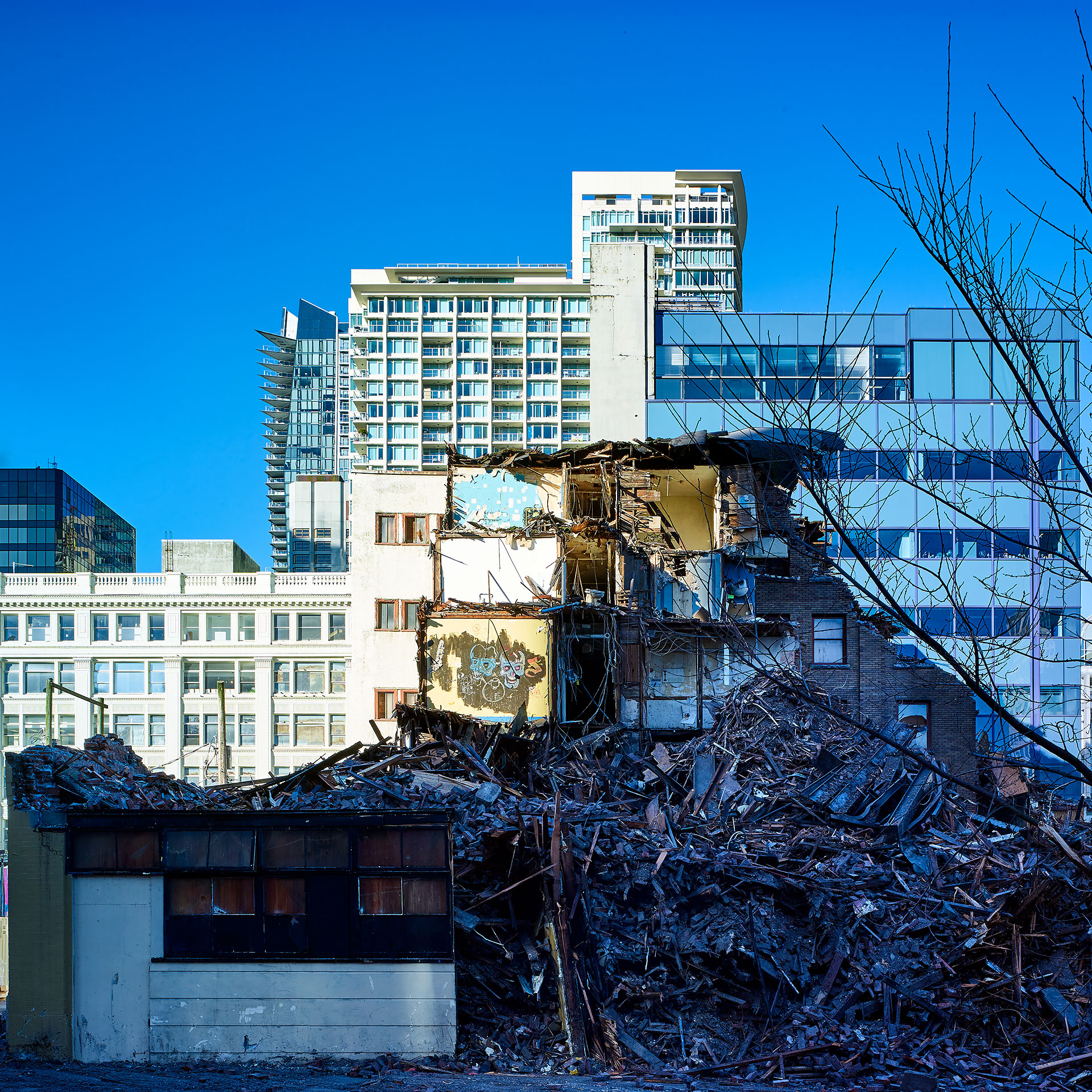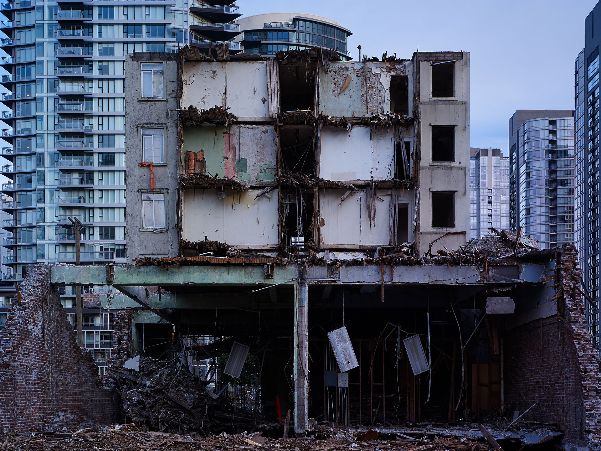 In the fast-paced real estate market that is Vancouver, land assemblies and buildings with “too much air” above them are being razed at an ever-increasing rate. The photographic project, ‘Deconstruction’ captures this activity mid-stream, creating images that are both documentary and abstract. As the process of deconstruction is slower than traditional demolition, opportunities arise to capture the inner structures of buildings, and the remains of its former purpose.