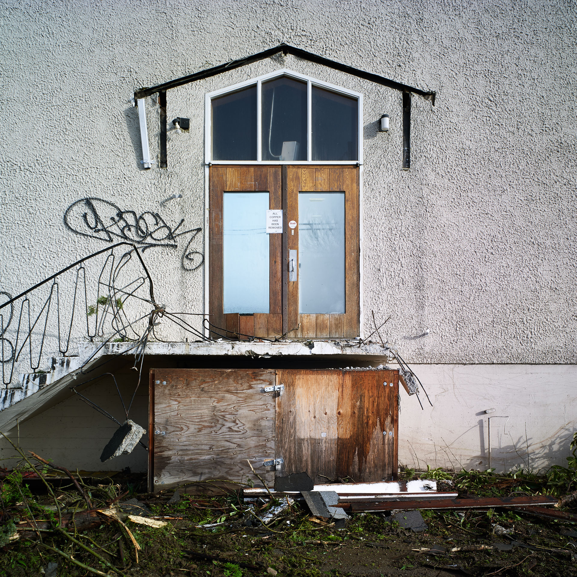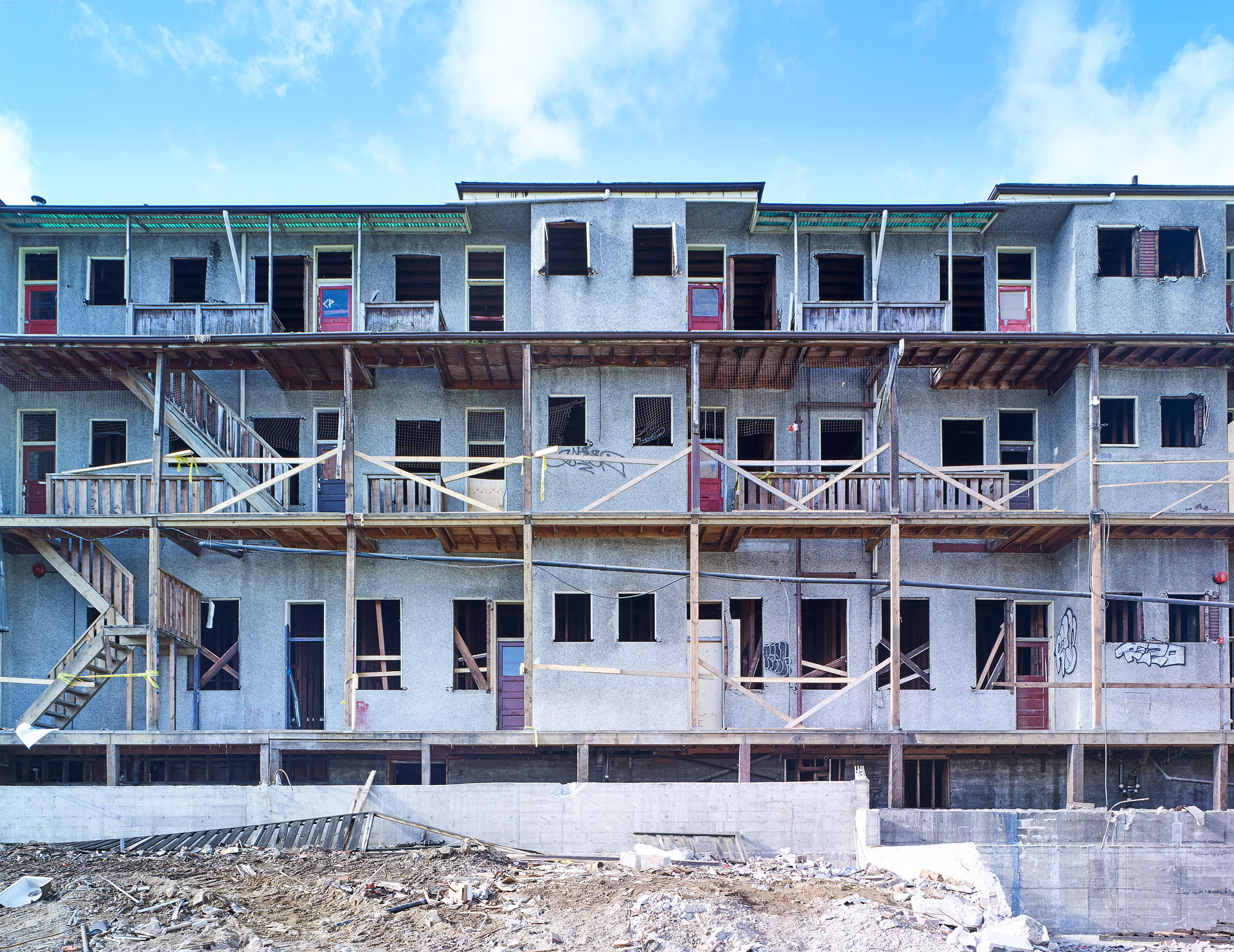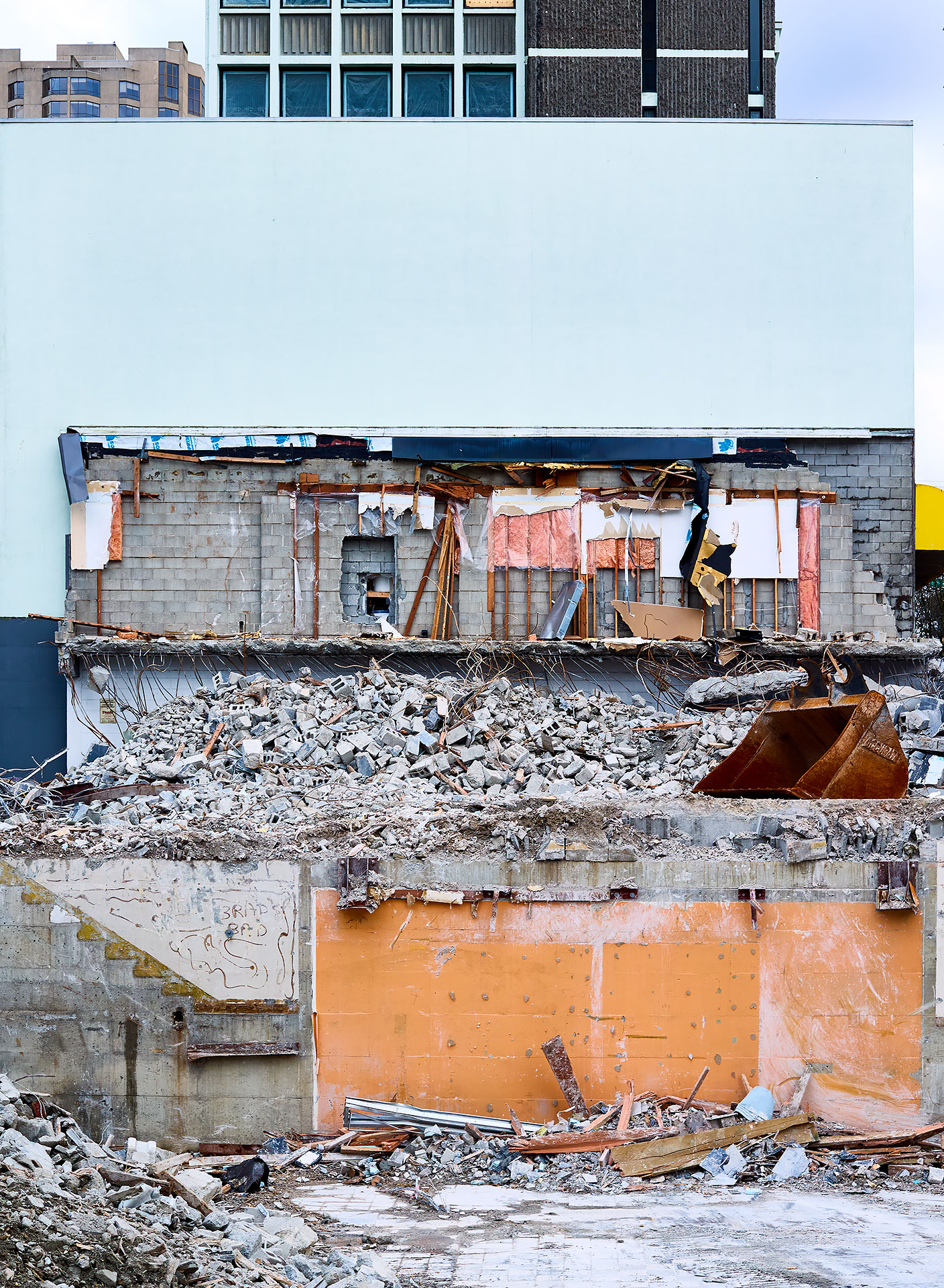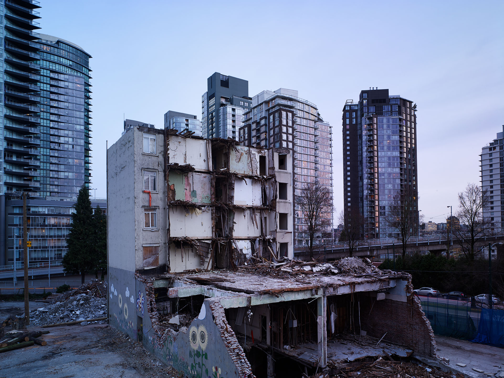 In the fast-paced real estate market that is Vancouver, land assemblies and buildings with “too much air” above them are being razed at an ever-increasing rate. The photographic project, ‘Deconstruction’ captures this activity mid-stream, creating images that are both documentary and abstract. As the process of deconstruction is slower than traditional demolition, opportunities arise to capture the inner structures of buildings, and the remains of its former purpose.