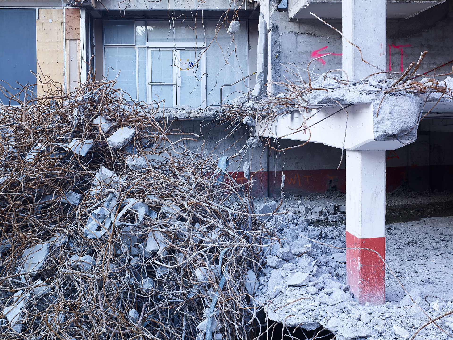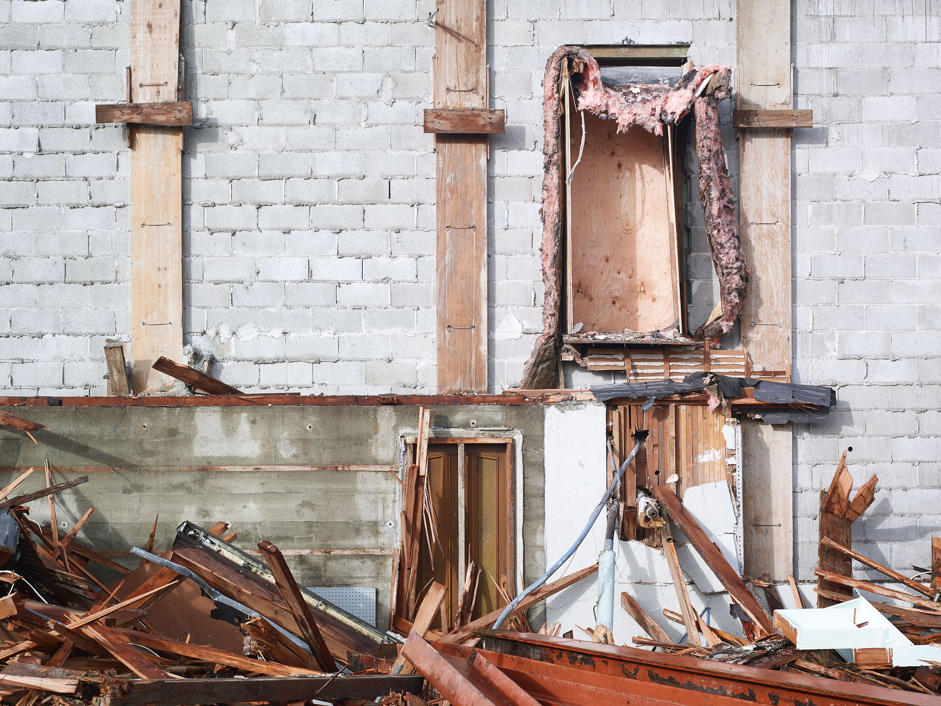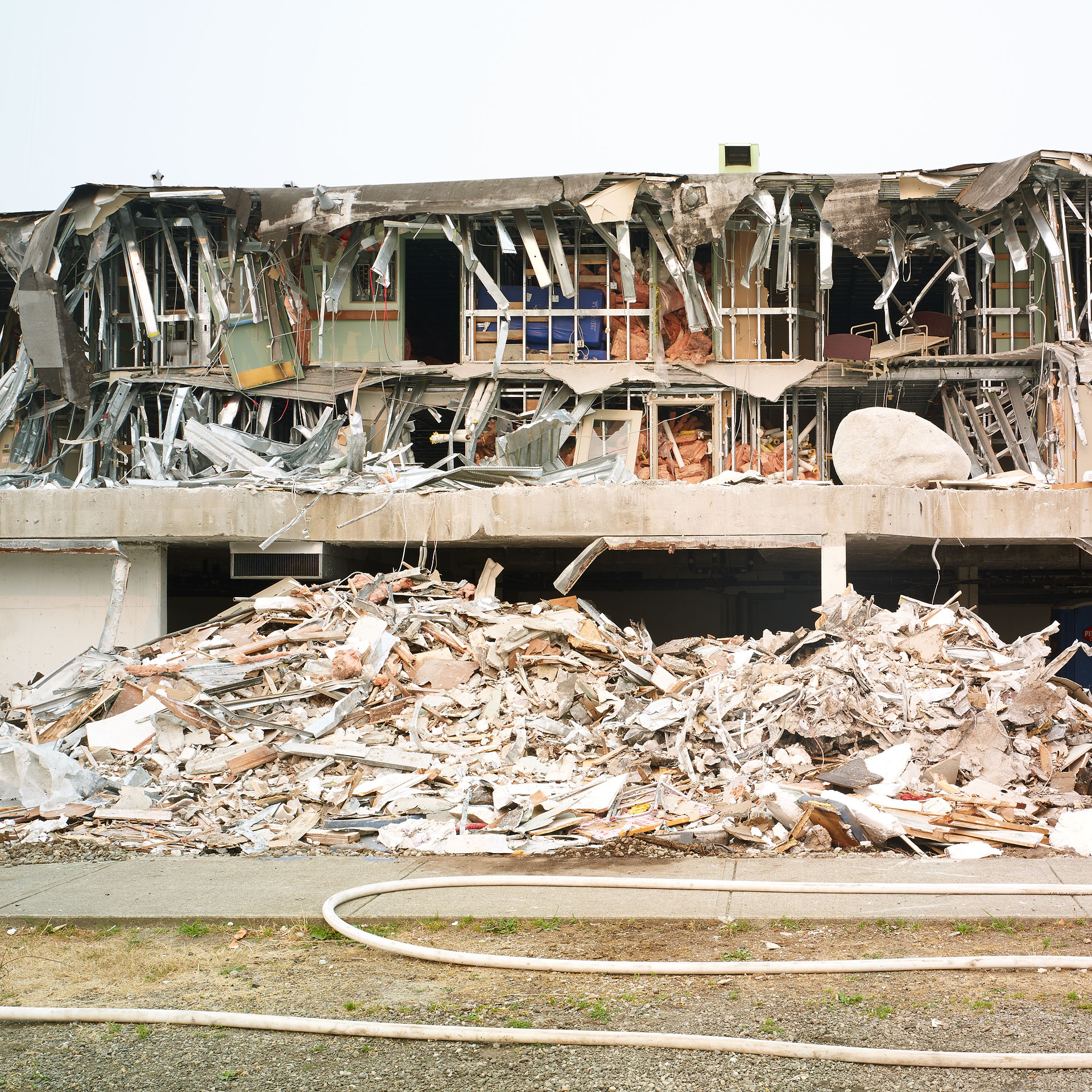‘Deconstruction’ shares many similar aspects to my previous work, ‘Pyres’, wherein, the image is but a document of what I like to consider as the, “unintended artistry of the excavator operator”. The excavator operator acts as a curator of construction debris, categorizing the valuable recyclable materials – concrete, rebar, metal, and wood – into discrete piles, while slowly picking away at the building itself. By making photographs during the deconstruction process, it is as though I have captured the building while caught in the act between being, and not being, simultaneously revealing the mysteries of its construction in its deconstruction.