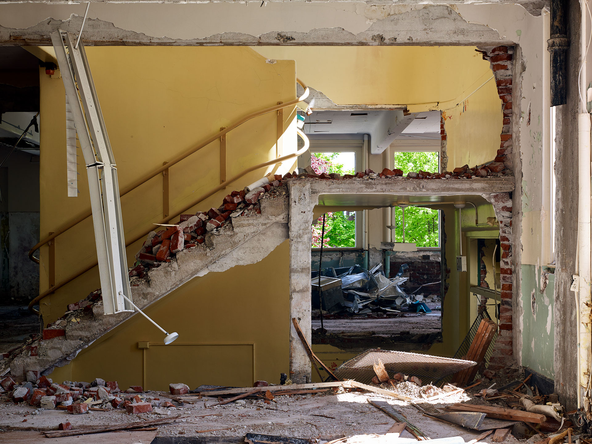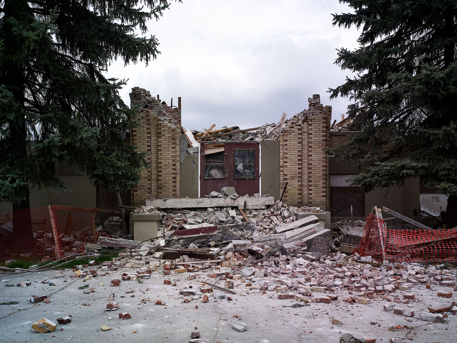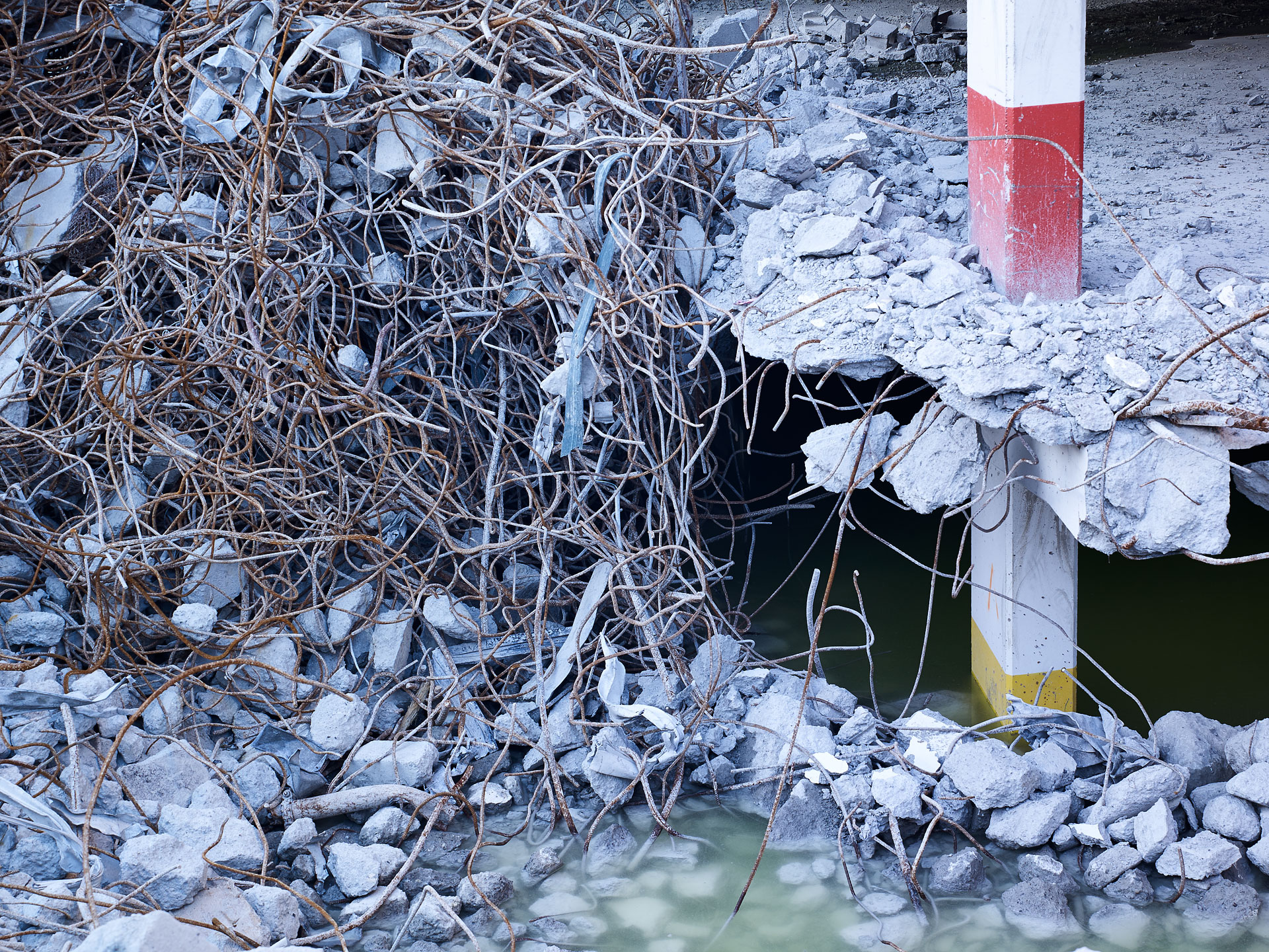 ‘Deconstruction’ shares many similar aspects to my previous work, ‘Pyres’, wherein, the image is but a document of what I like to consider as the, “unintended artistry of the excavator operator”. The excavator operator acts as a curator of construction debris, categorizing the valuable recyclable materials – concrete, rebar, metal, and wood – into discrete piles, while slowly picking away at the building itself. By making photographs during the deconstruction process, it is as though I have captured the building while caught in the act between being, and not being, simultaneously revealing the mysteries of its construction in its deconstruction.