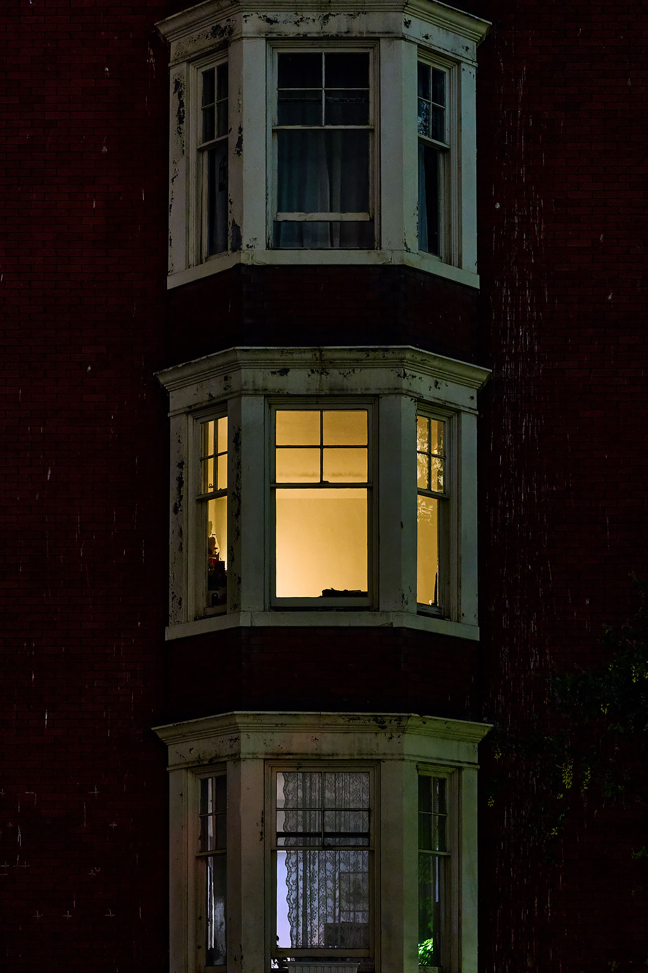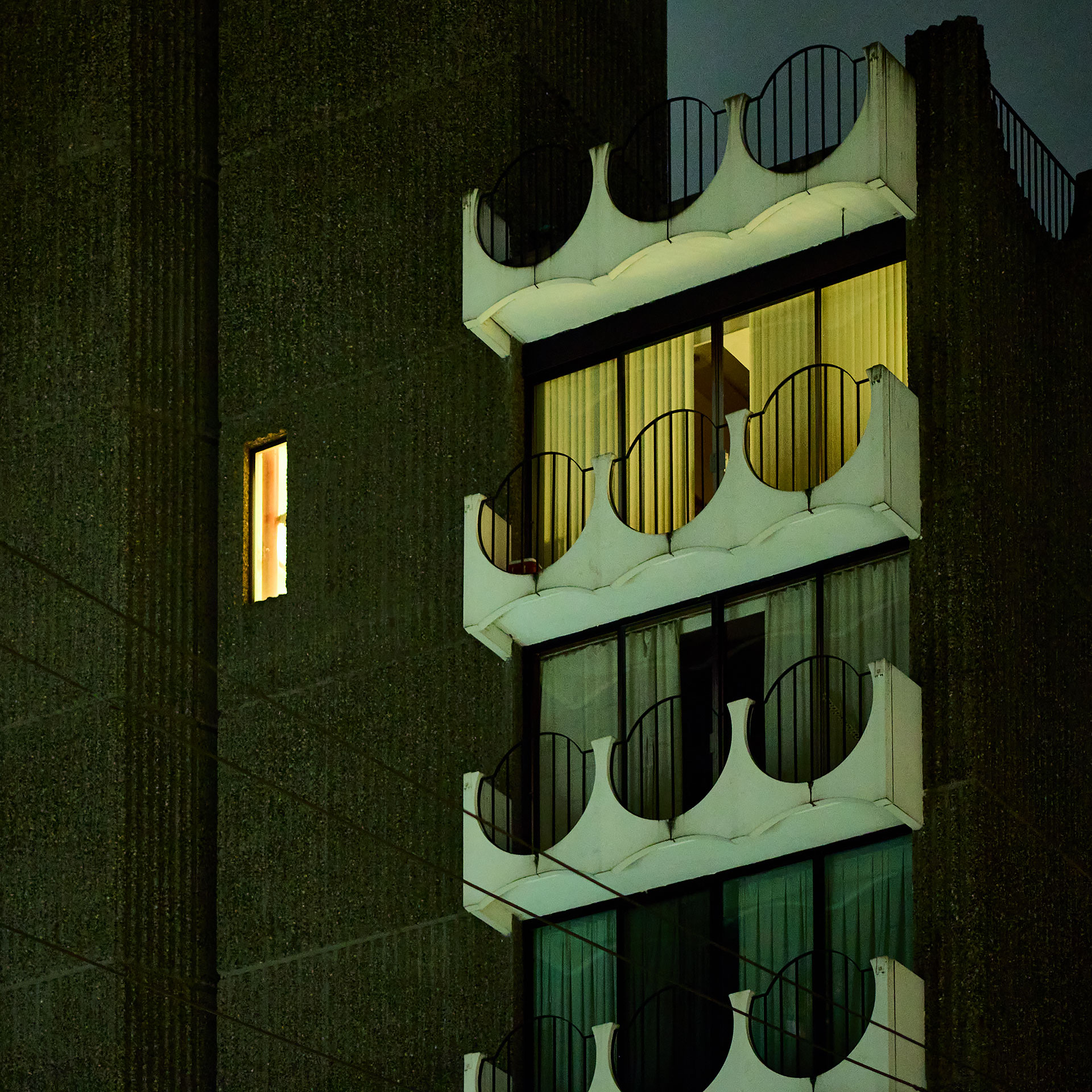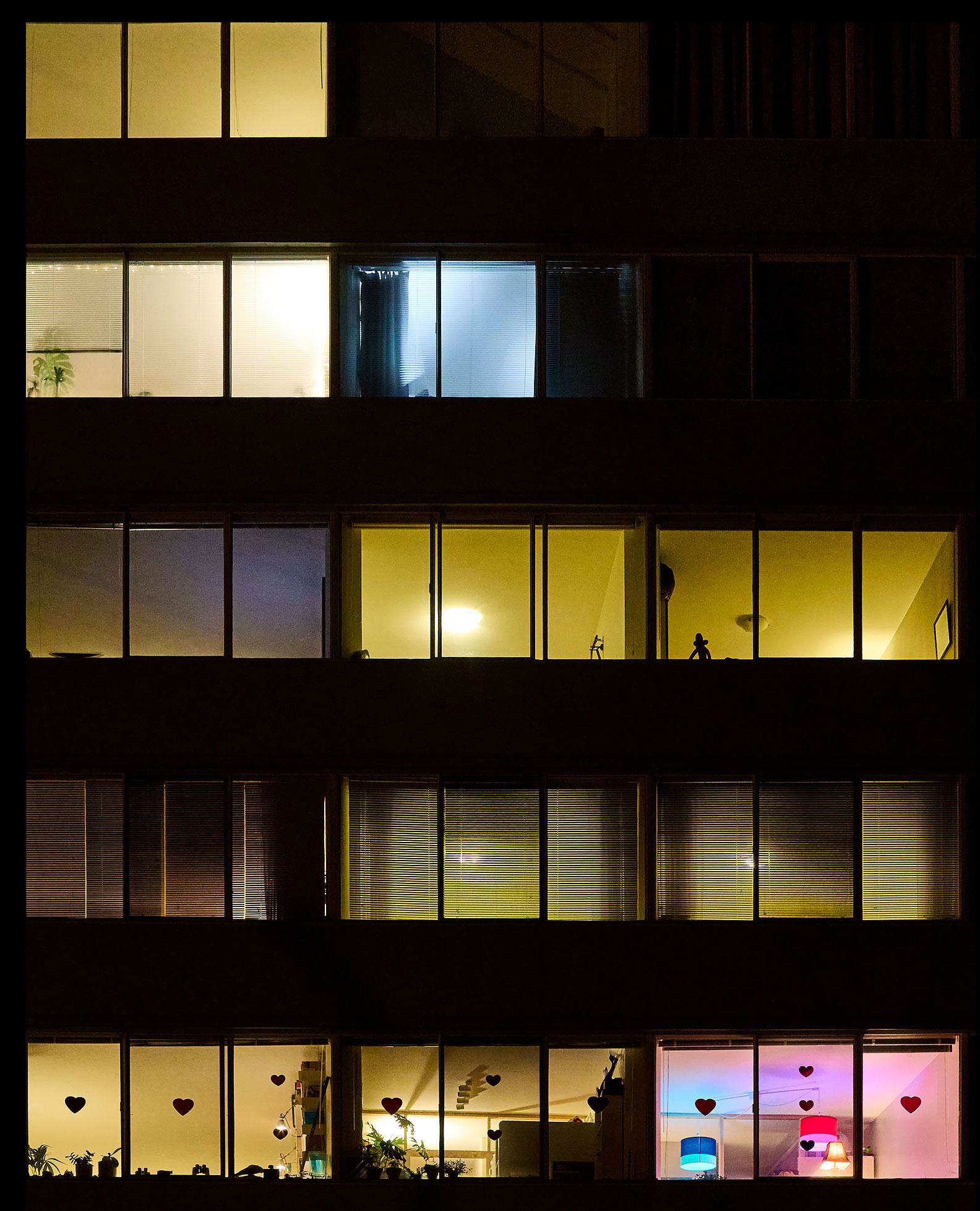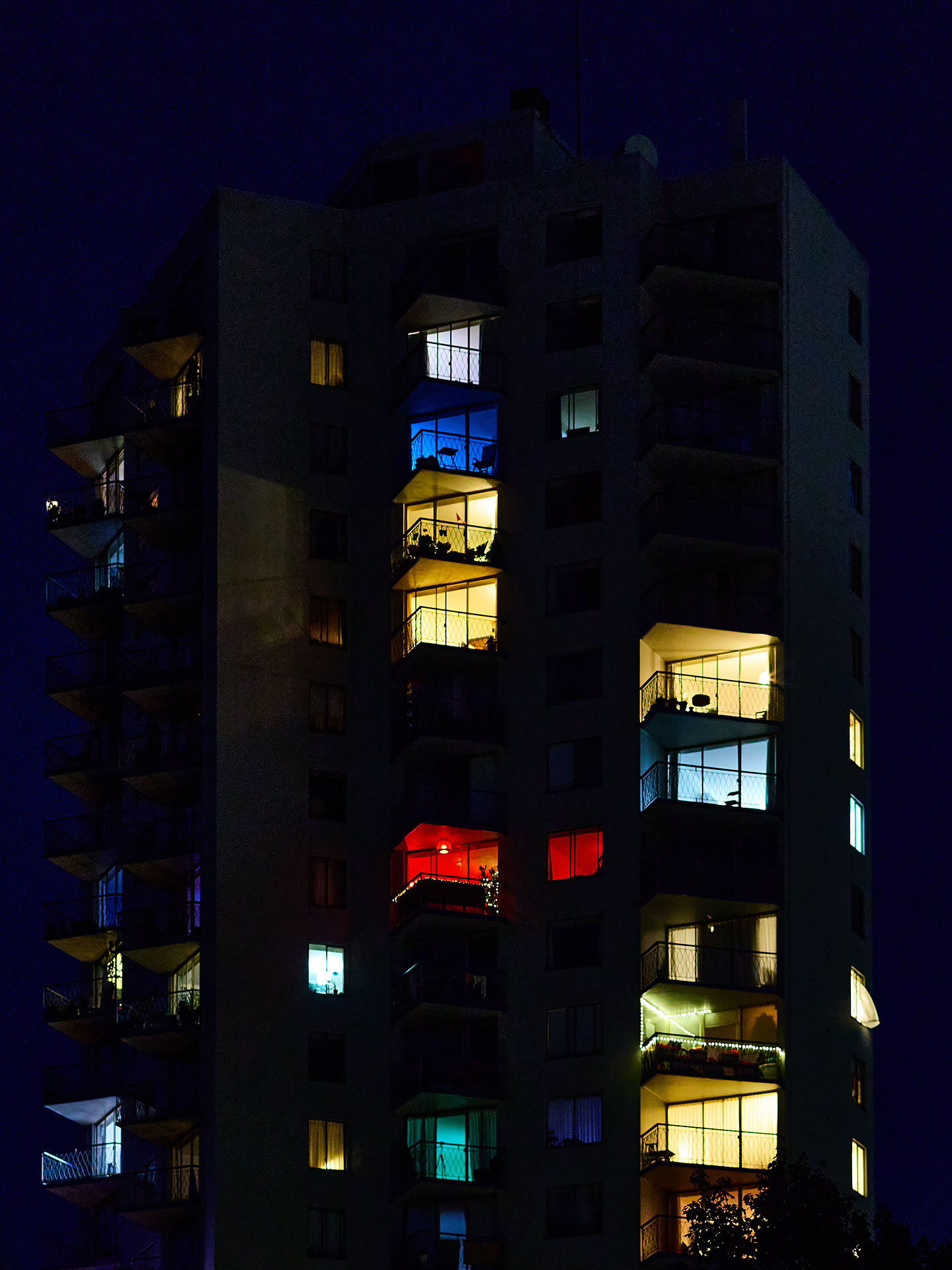 By design apartment buildings are stacks of identical units. From the outside the windows are all the same shape, yet each window is unique and presents the tenant’s personality to the outside world. Walking around the West End at night I was attracted by the contrasting colours of light people use in their apartments and in the contrast of light and dark that takes familiar shapes and distorts them into glowing geometric forms.