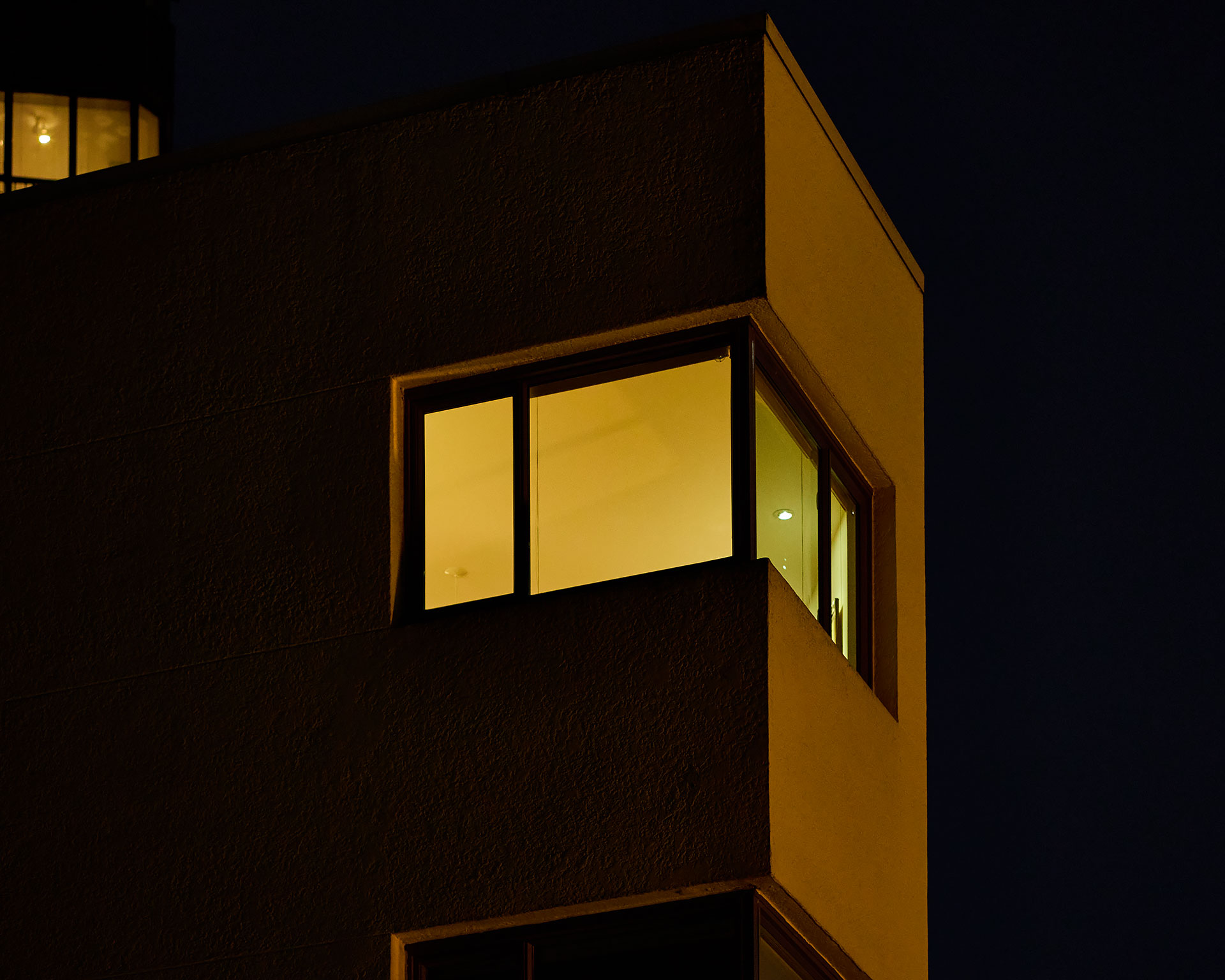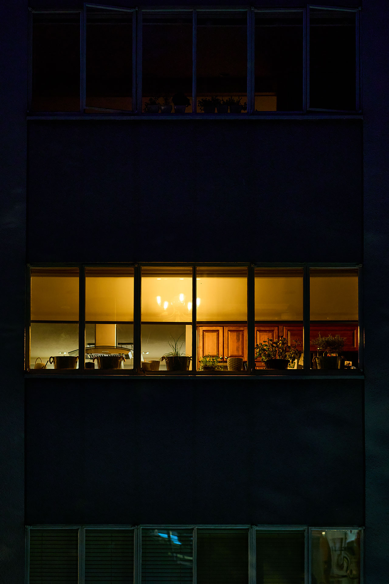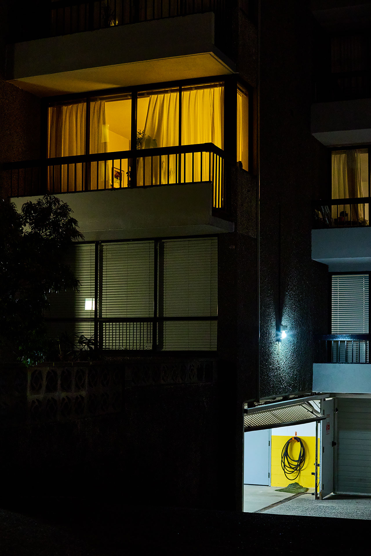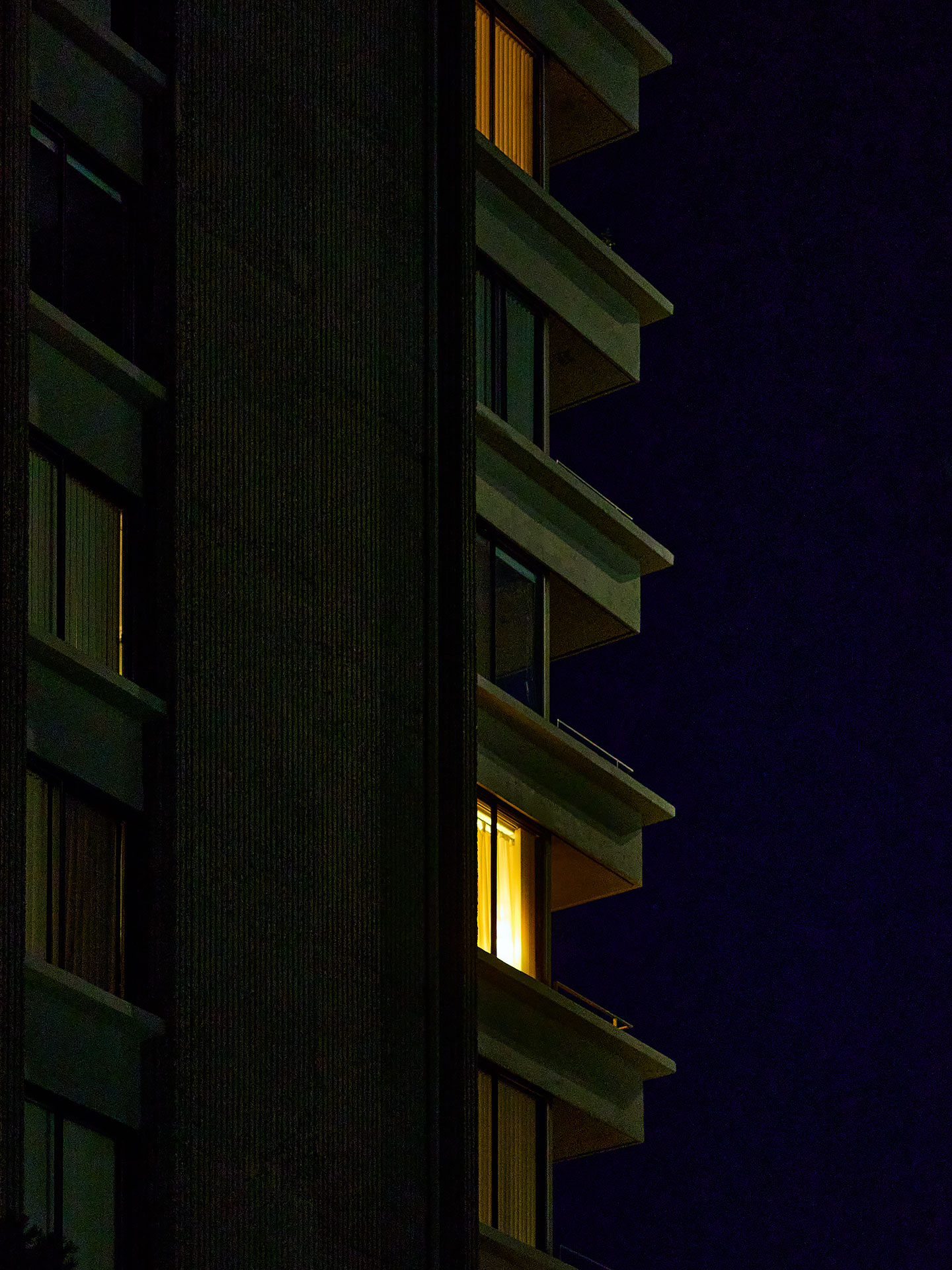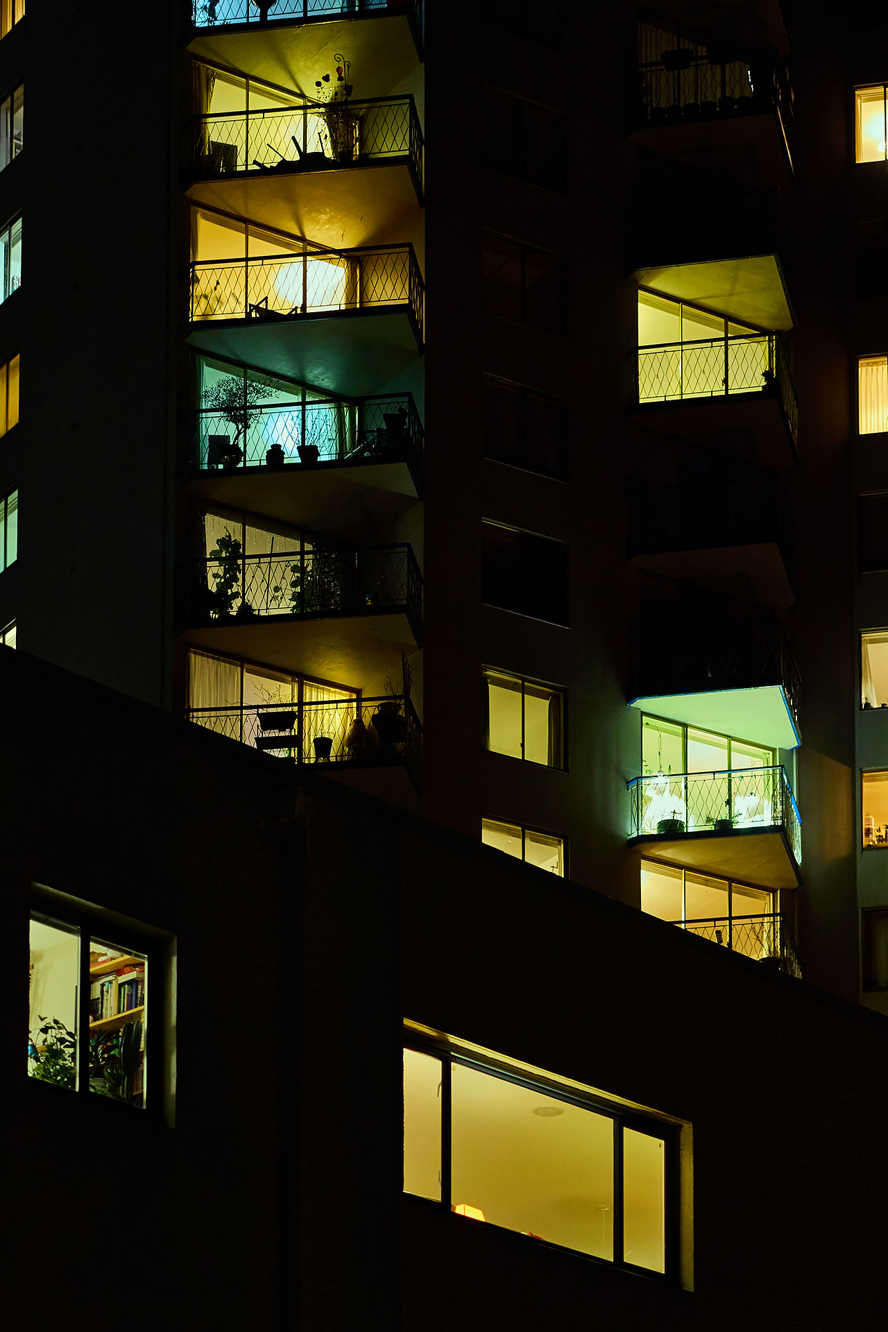 By design apartment buildings are stacks of identical units. From the outside the windows are all the same shape, yet each window is unique and presents the tenant’s personality to the outside world. Walking around the West End at night I was attracted by the contrasting colours of light people use in their apartments and in the contrast of light and dark that takes familiar shapes and distorts them into glowing geometric forms.