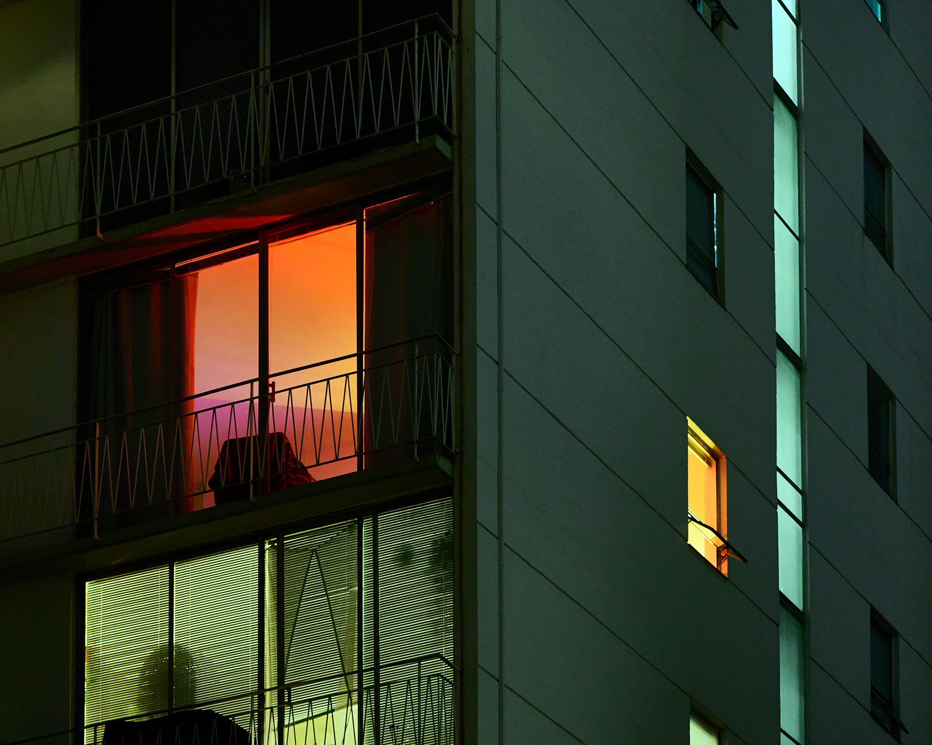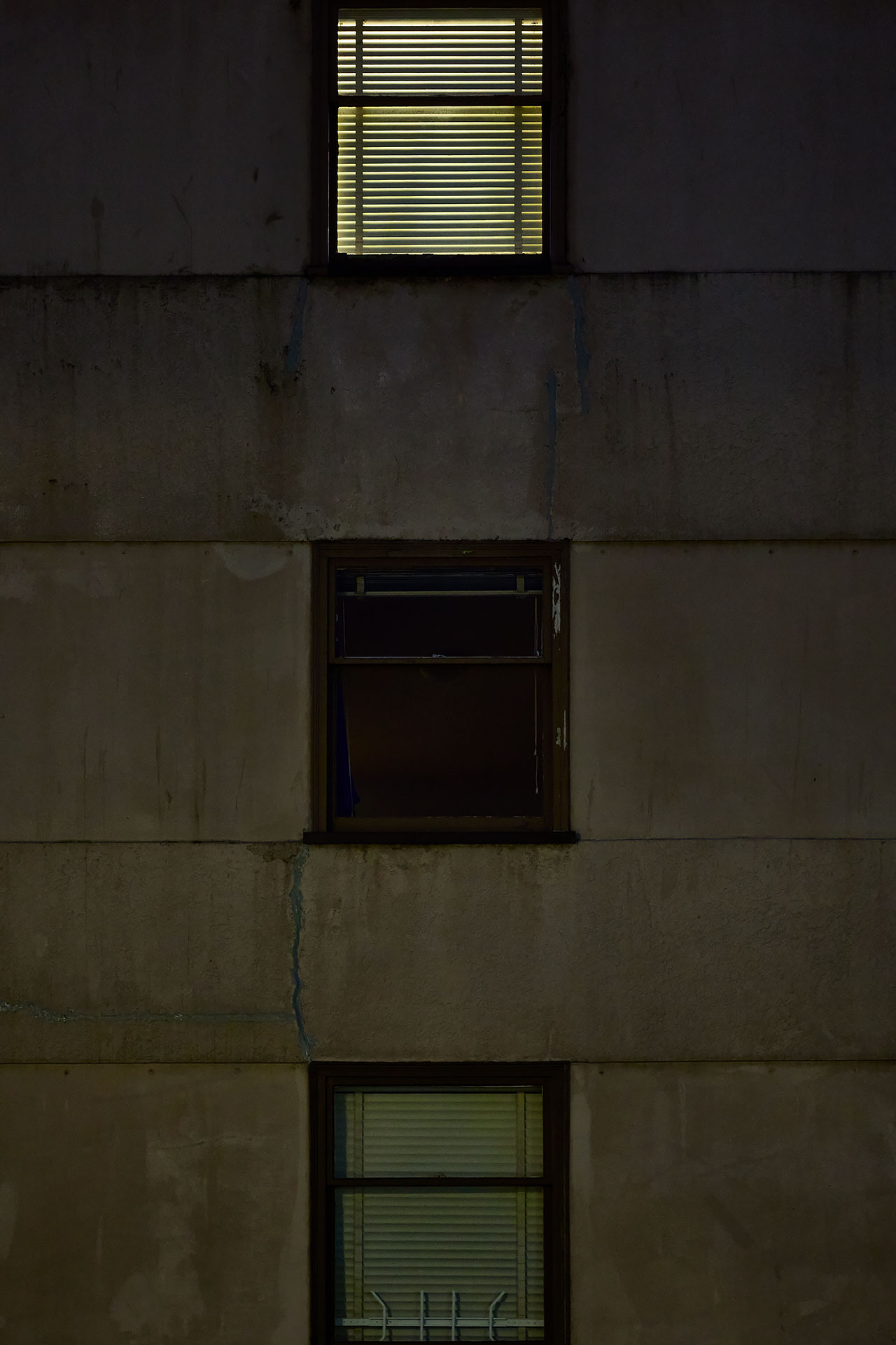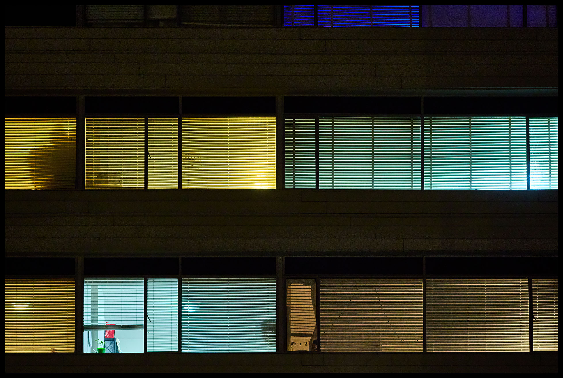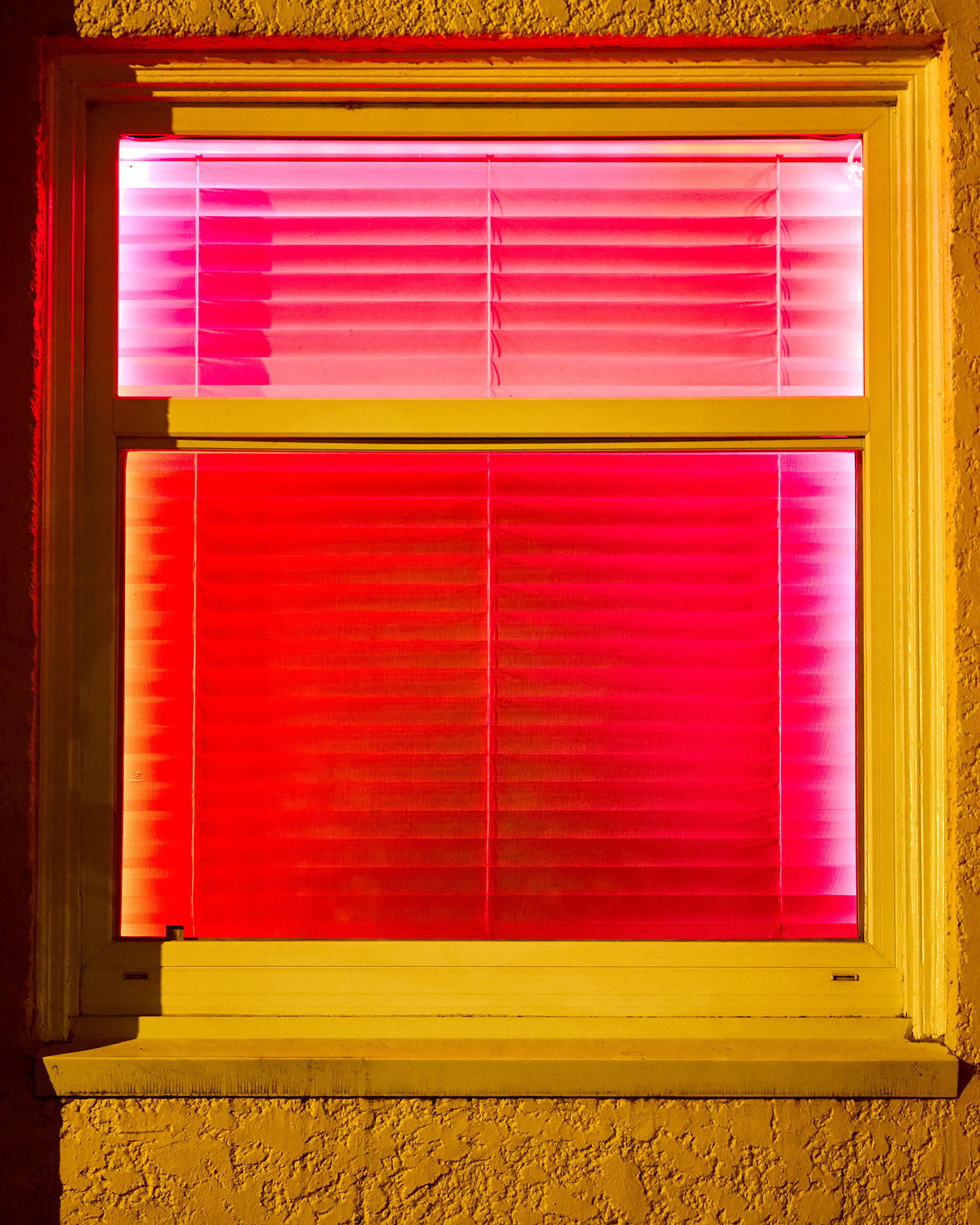 By design apartment buildings are stacks of identical units. From the outside the windows are all the same shape, yet each window is unique and presents the tenant’s personality to the outside world. Walking around the West End at night I was attracted by the contrasting colours of light people use in their apartments and in the contrast of light and dark that takes familiar shapes and distorts them into glowing geometric forms.