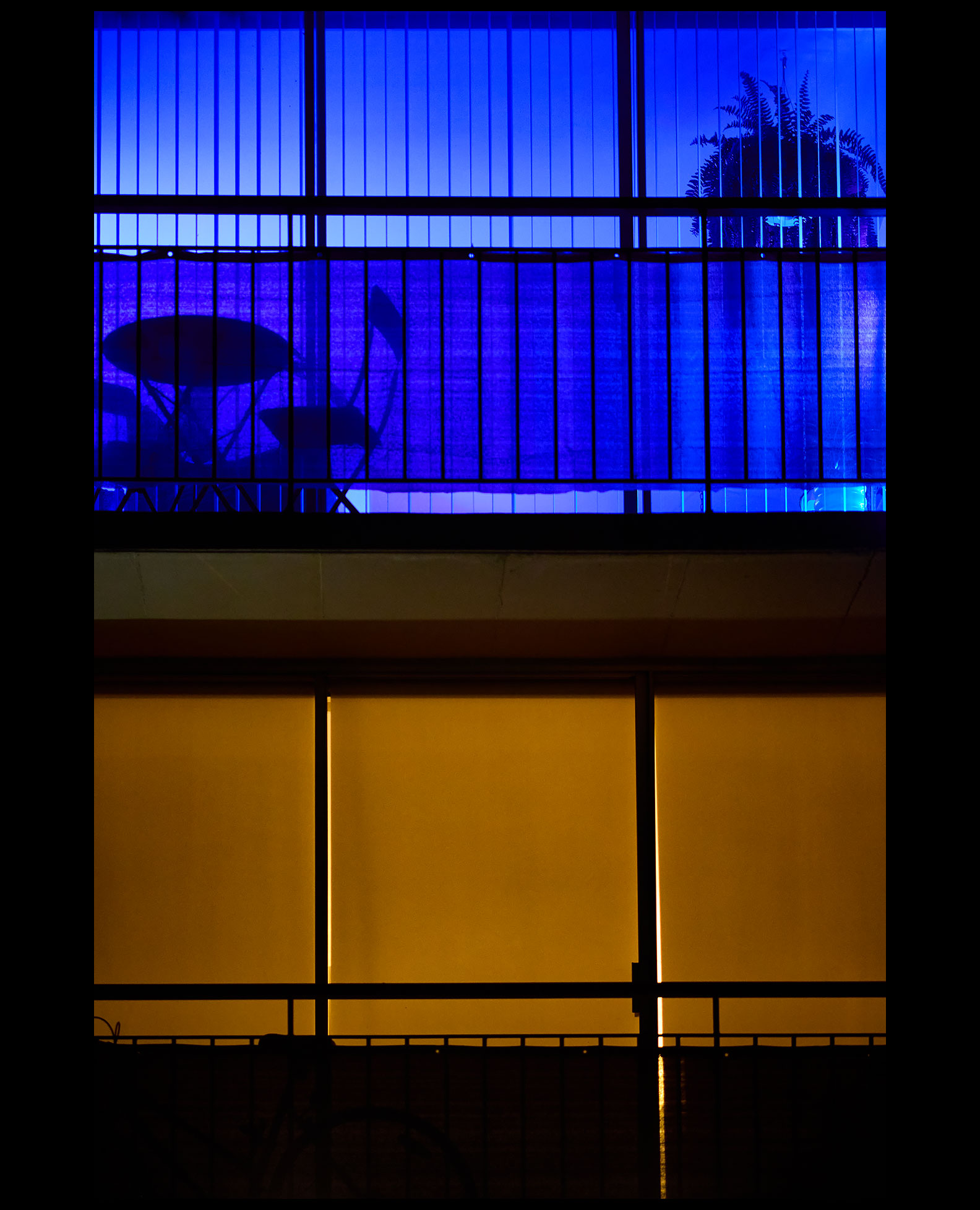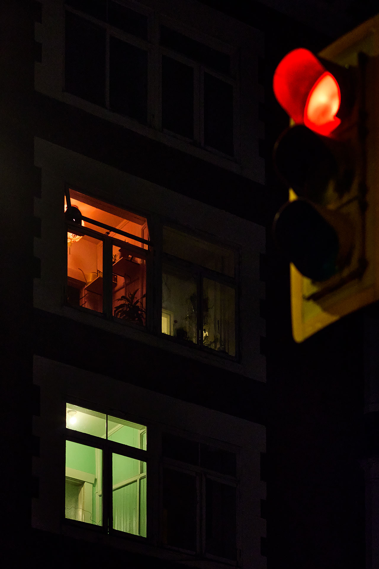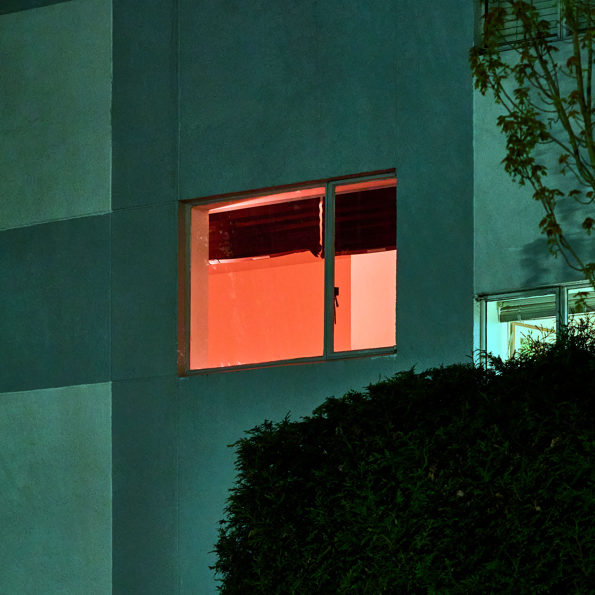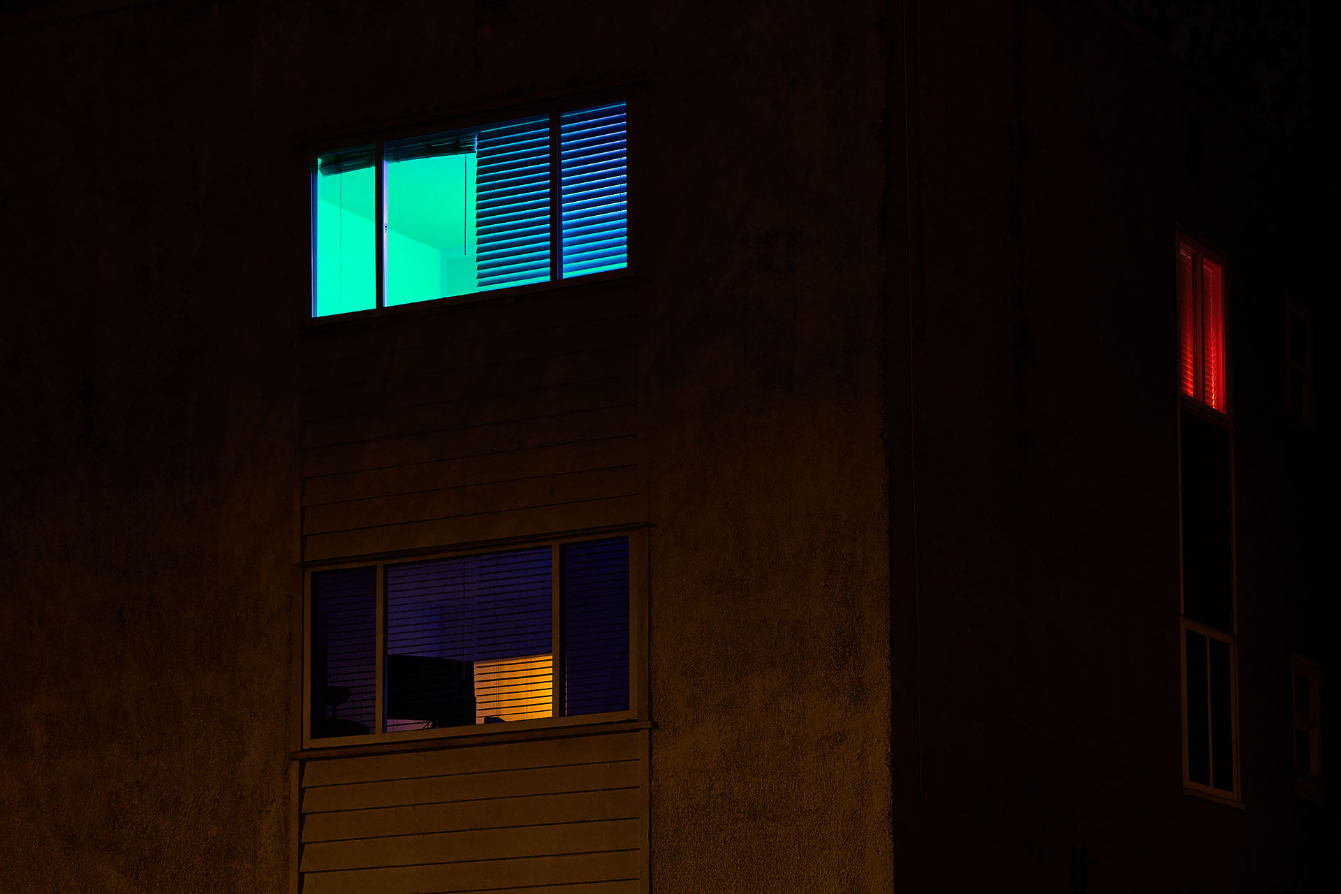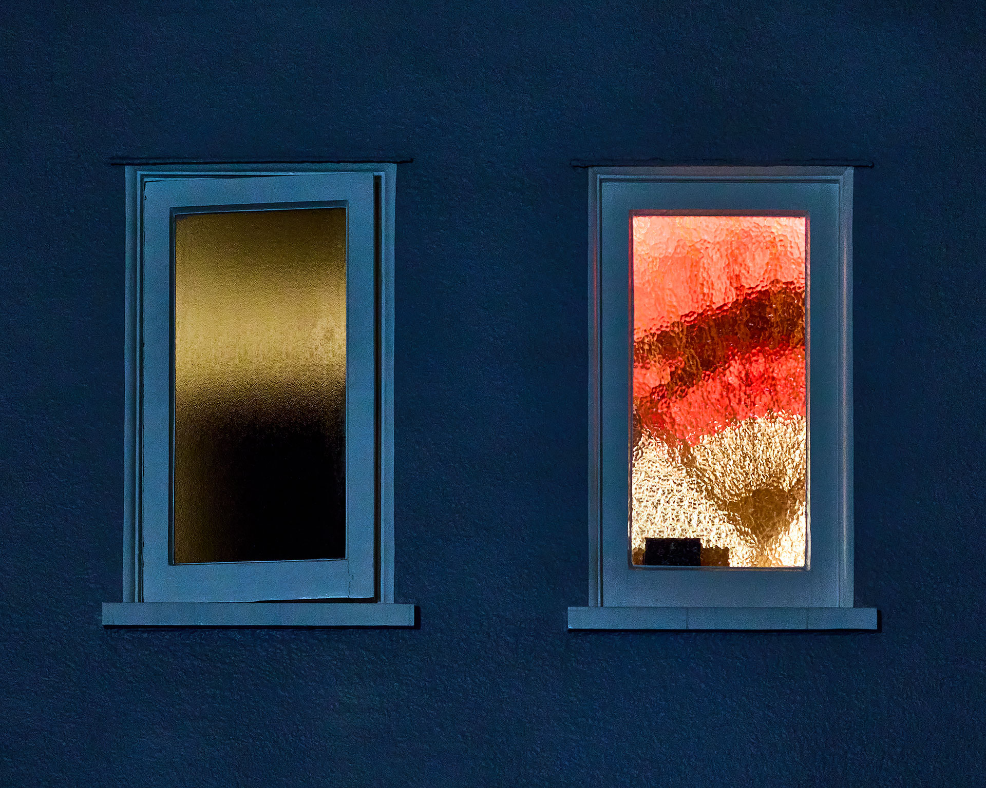 By design apartment buildings are stacks of identical units. From the outside the windows are all the same shape, yet each window is unique and presents the tenant’s personality to the outside world. Walking around the West End at night I was attracted by the contrasting colours of light people use in their apartments and in the contrast of light and dark that takes familiar shapes and distorts them into glowing geometric forms.