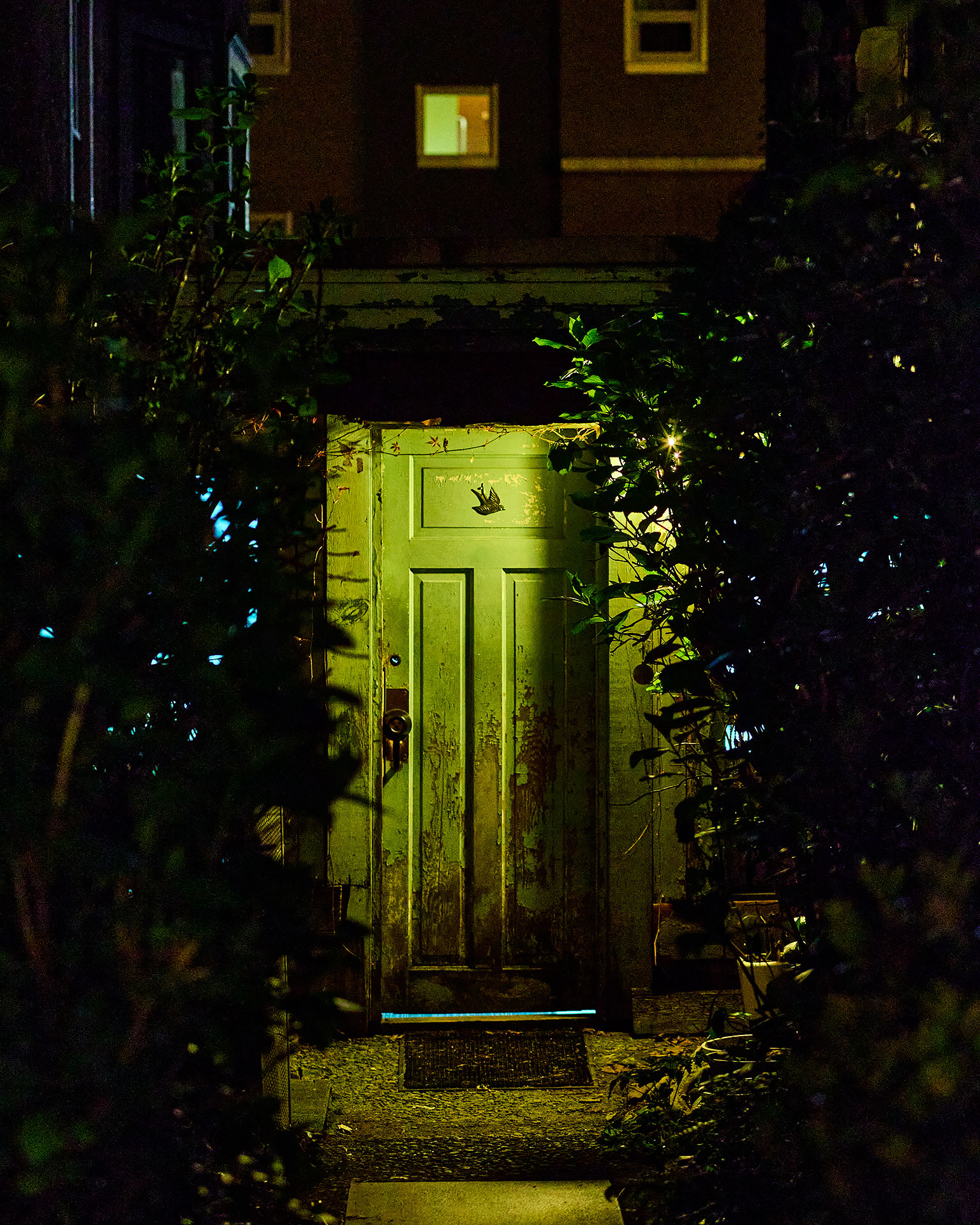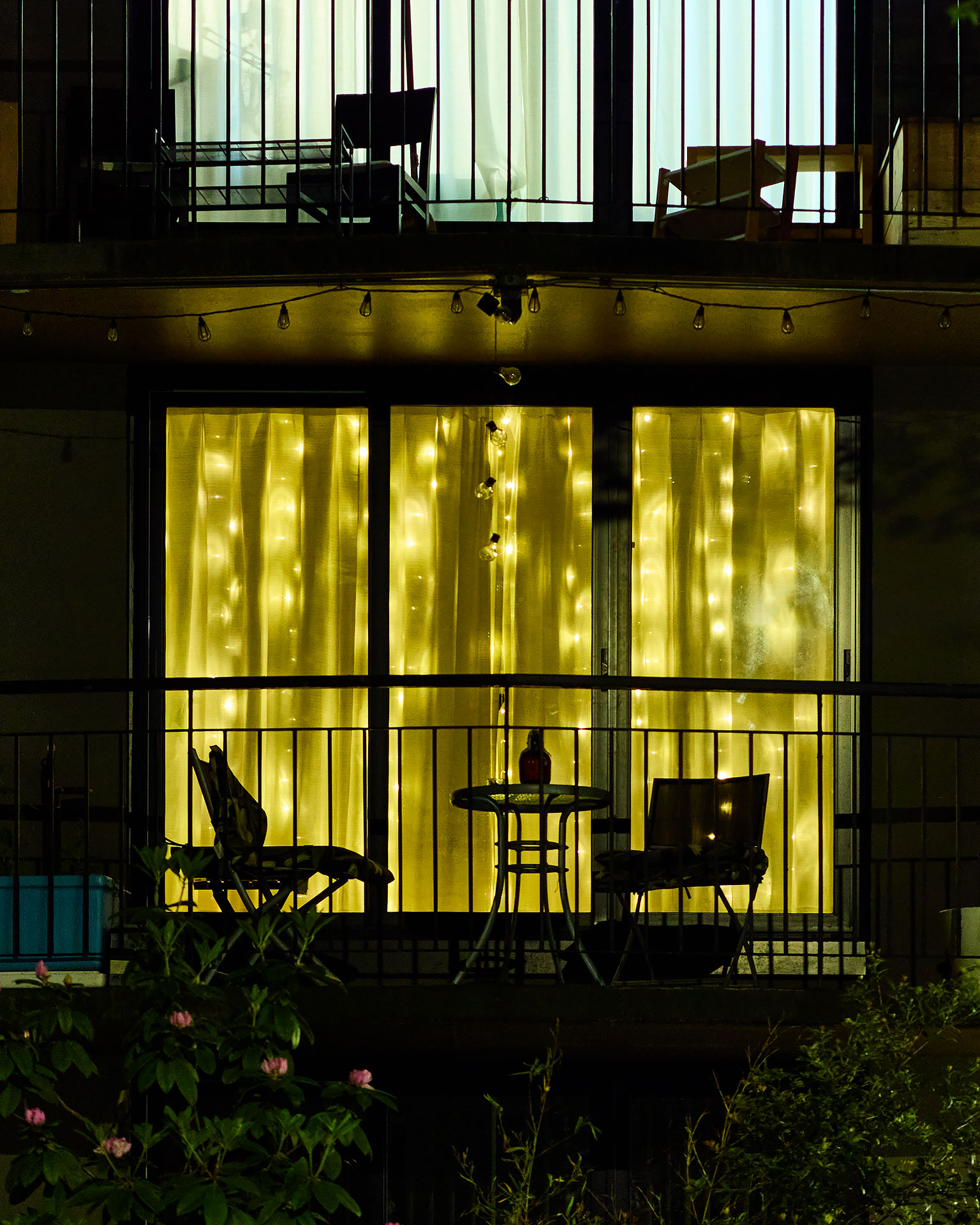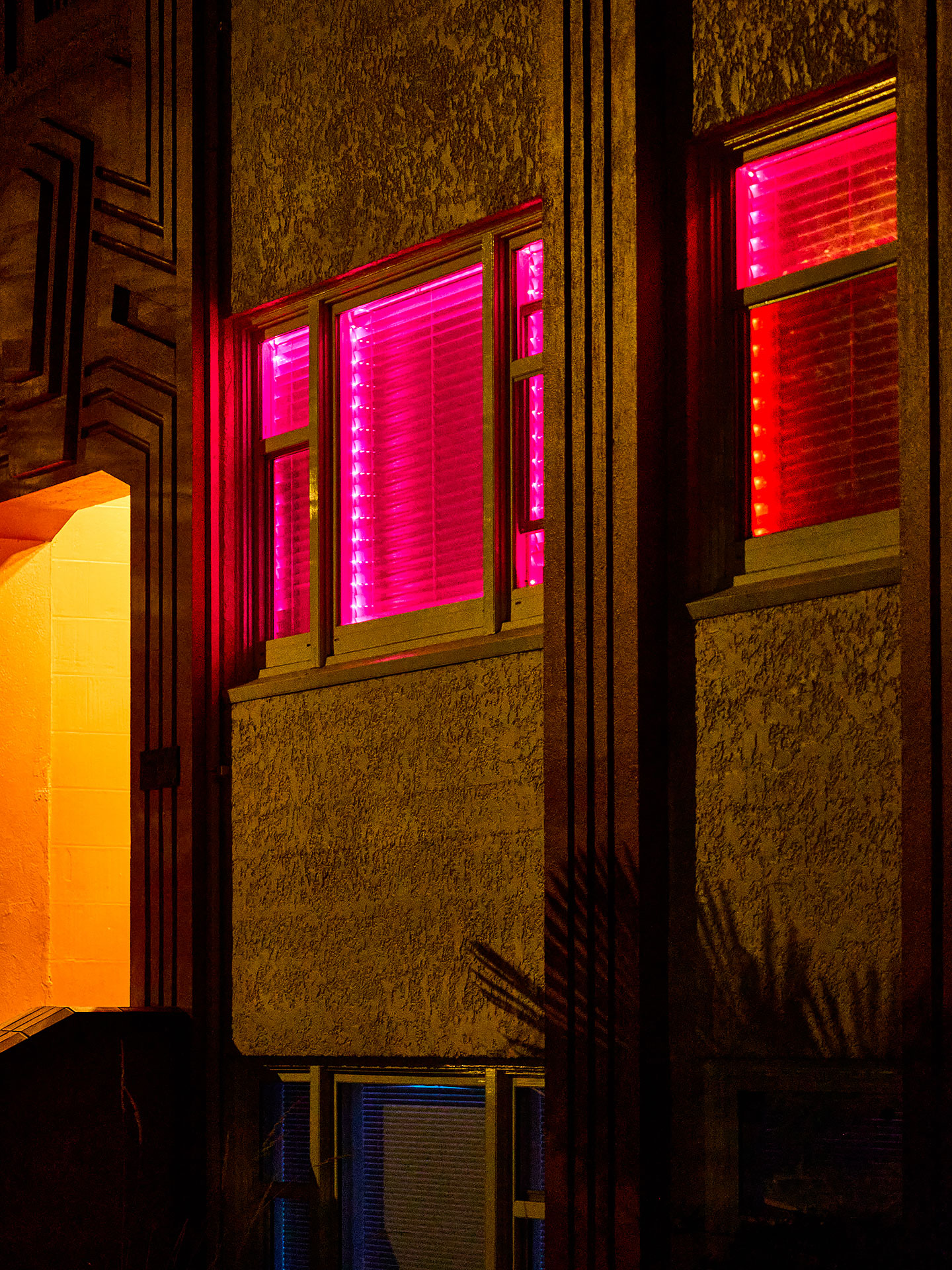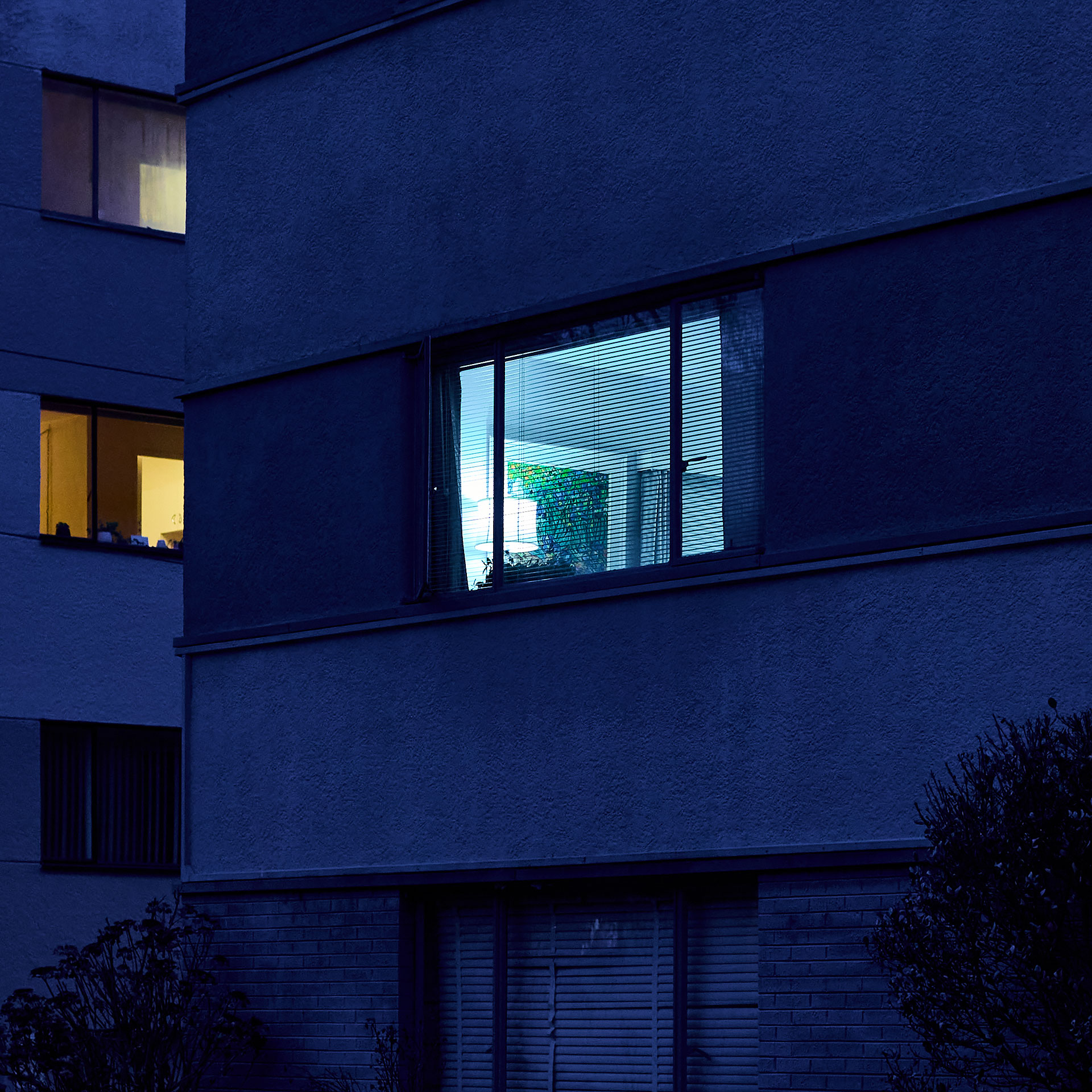 By design apartment buildings are stacks of identical units. From the outside the windows are all the same shape, yet each window is unique and presents the tenant’s personality to the outside world. Walking around the West End at night I was attracted by the contrasting colours of light people use in their apartments and in the contrast of light and dark that takes familiar shapes and distorts them into glowing geometric forms.