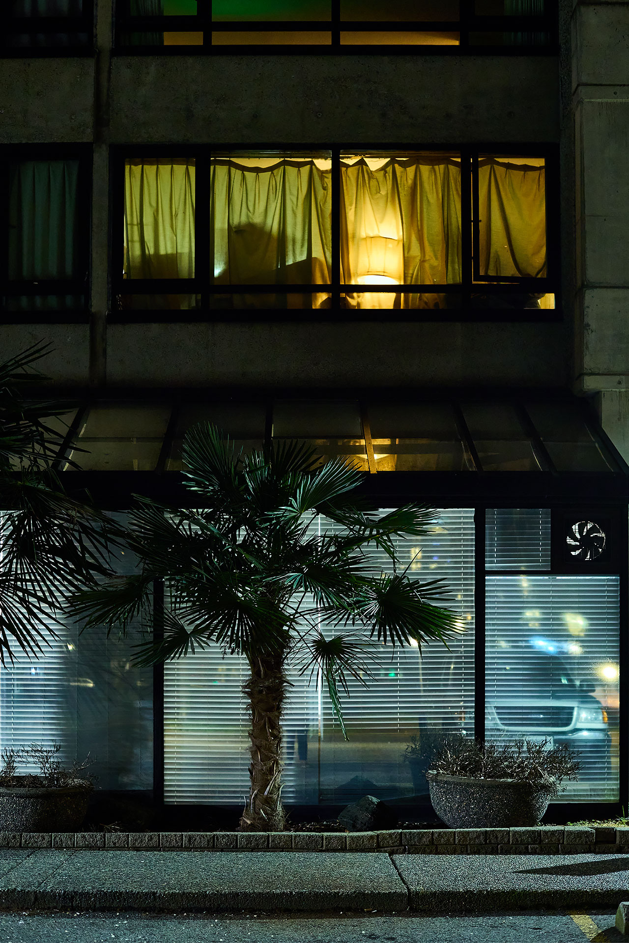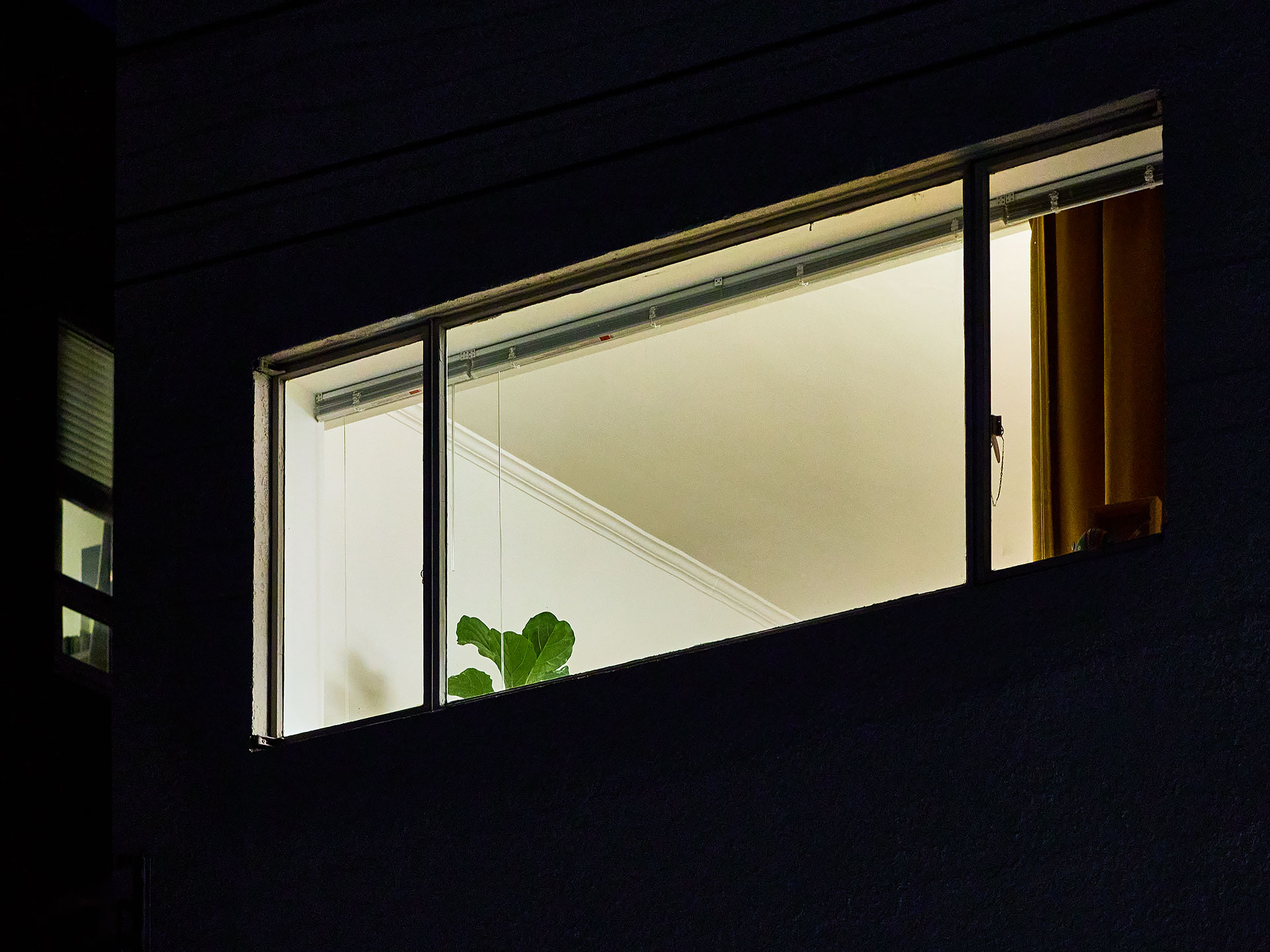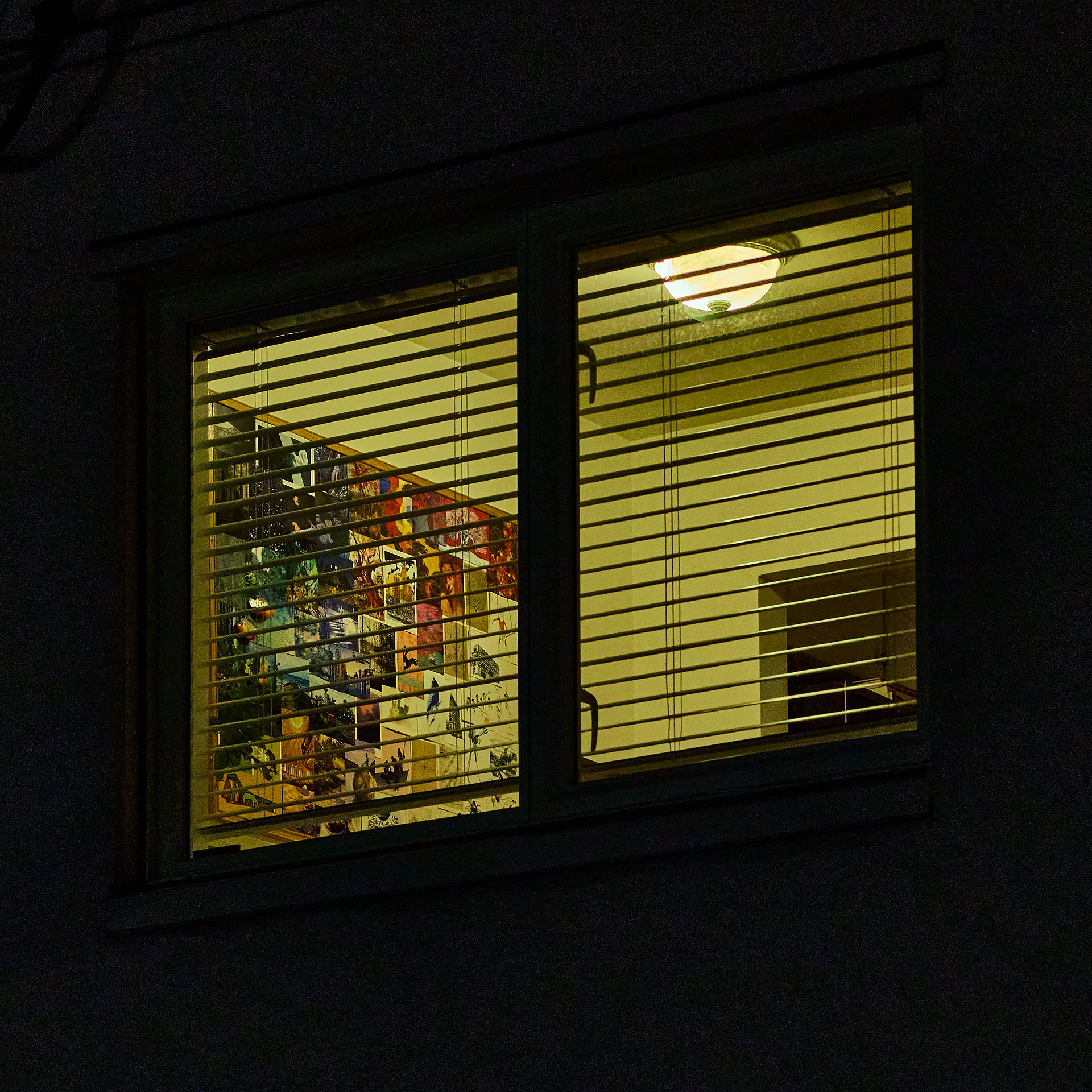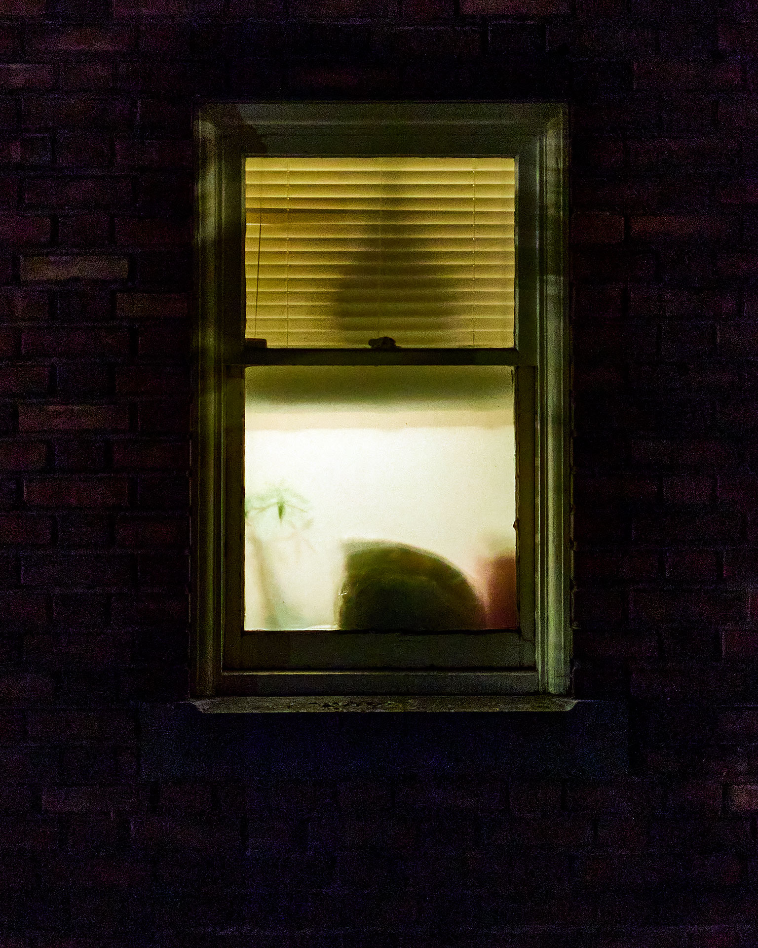We all do it. We look in people’s windows as we walk down the street. Living in Vancouver’s West End neighbourhood – a neighbourhood of apartment buildings – you can’t help but look up at a lit window as you walk by. The act feels transgressive. But, from the sidewalk, the view is acute and you can’t actually see in. The frame of the window becomes an abstract parallelogram where only ceilings, light fixtures, tall plants, tall furniture, and window sill detritus present themselves to you. Your transgression is made innocent by the negation of real access.