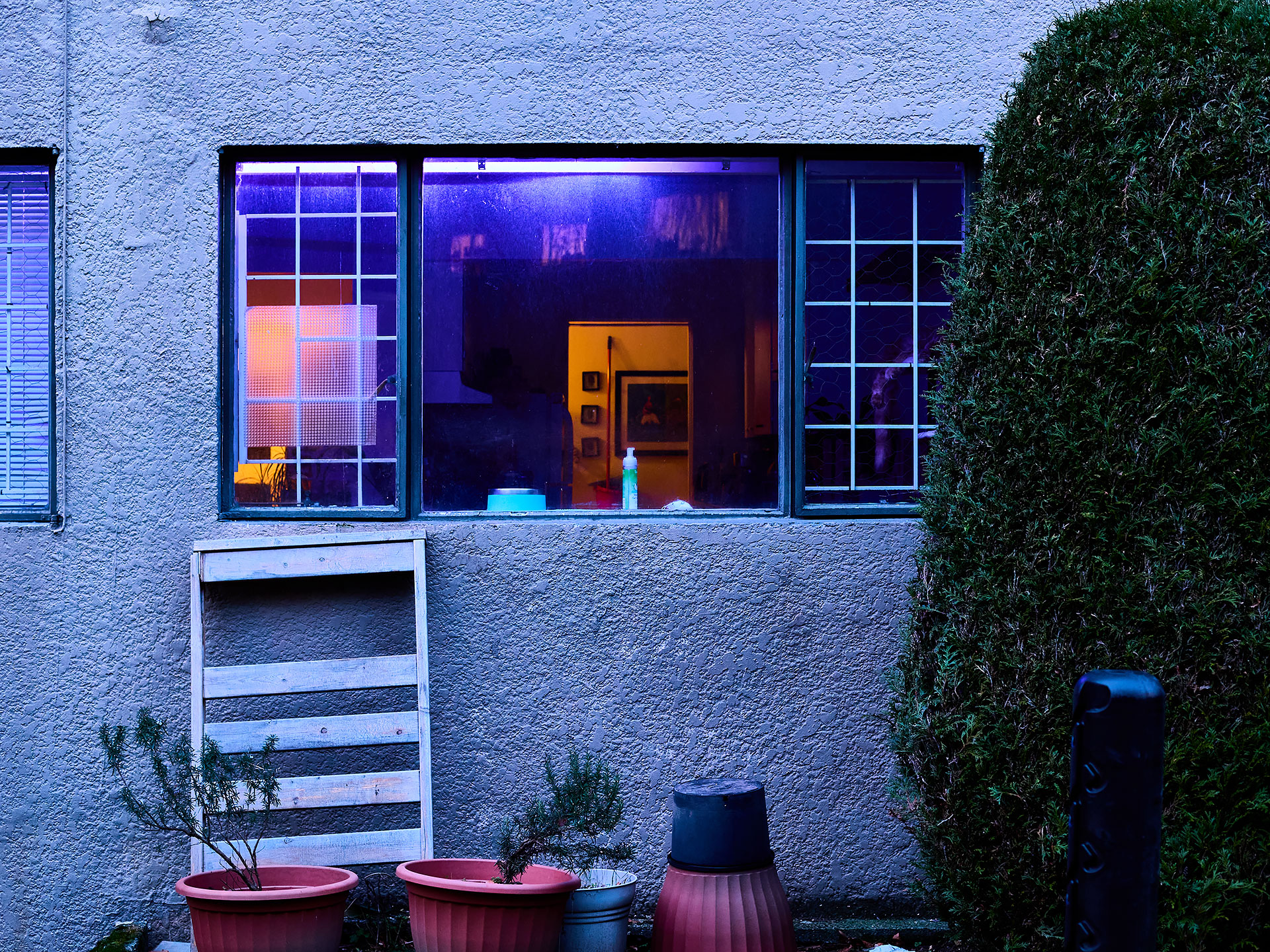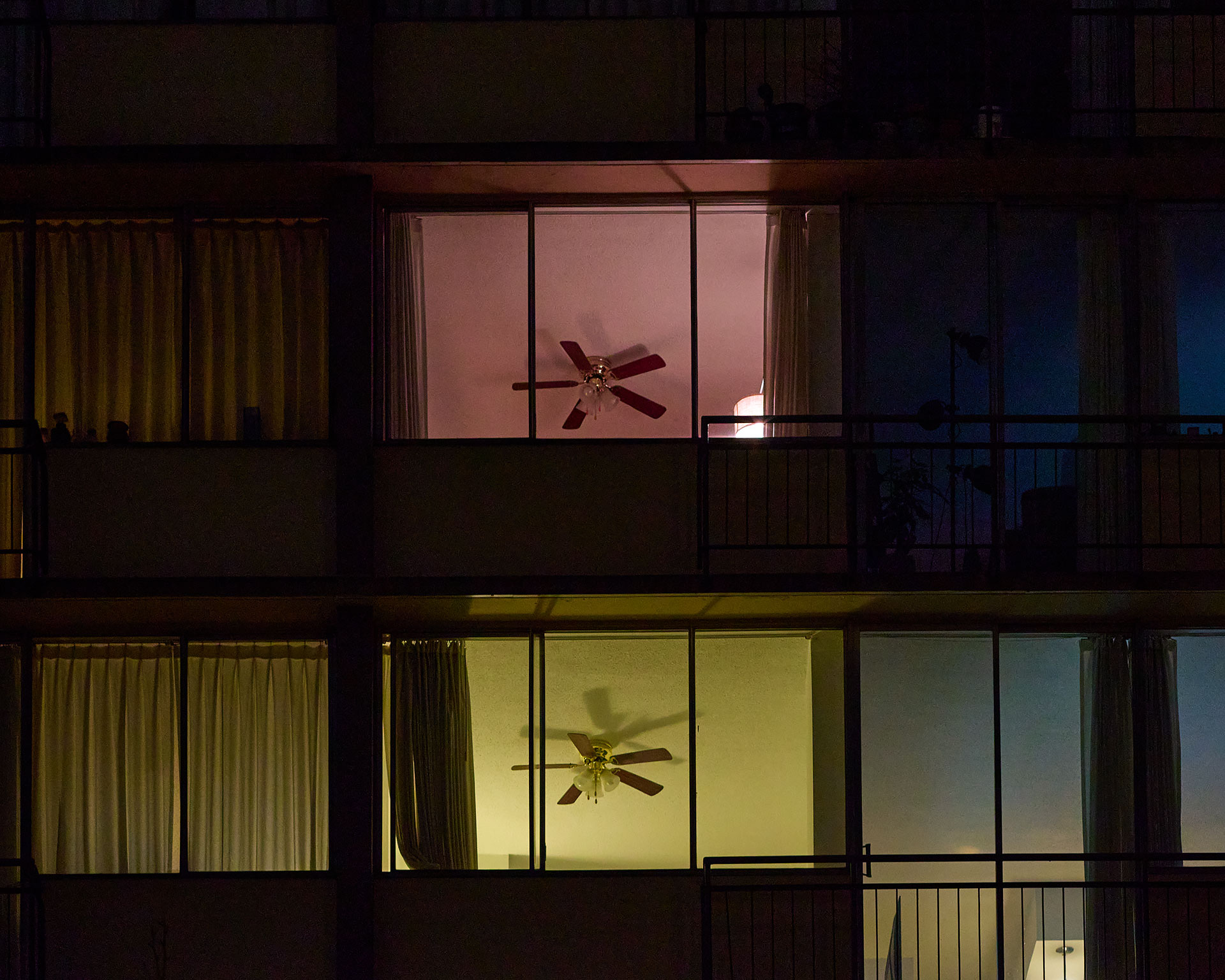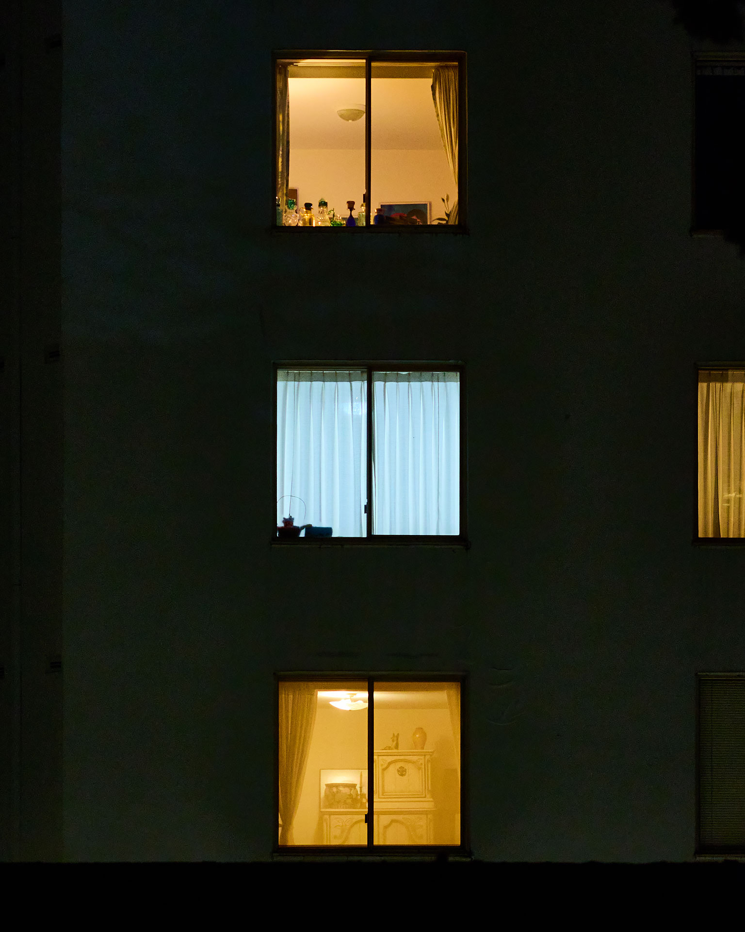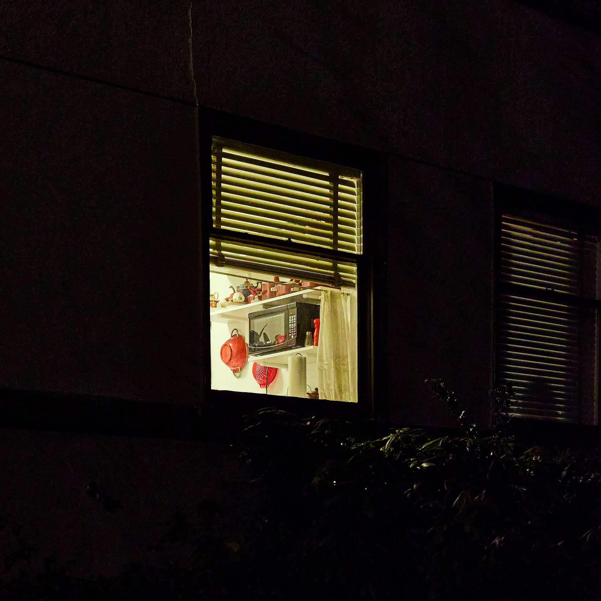 We all do it. We look in people’s windows as we walk down the street. Living in Vancouver’s West End neighbourhood – a neighbourhood of apartment buildings – you can’t help but look up at a lit window as you walk by. The act feels transgressive. But, from the sidewalk, the view is acute and you can’t actually see in. The frame of the window becomes an abstract parallelogram where only ceilings, light fixtures, tall plants, tall furniture, and window sill detritus present themselves to you. Your transgression is made innocent by the negation of real access.