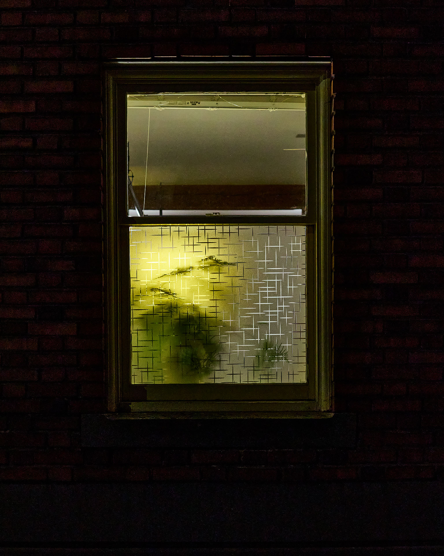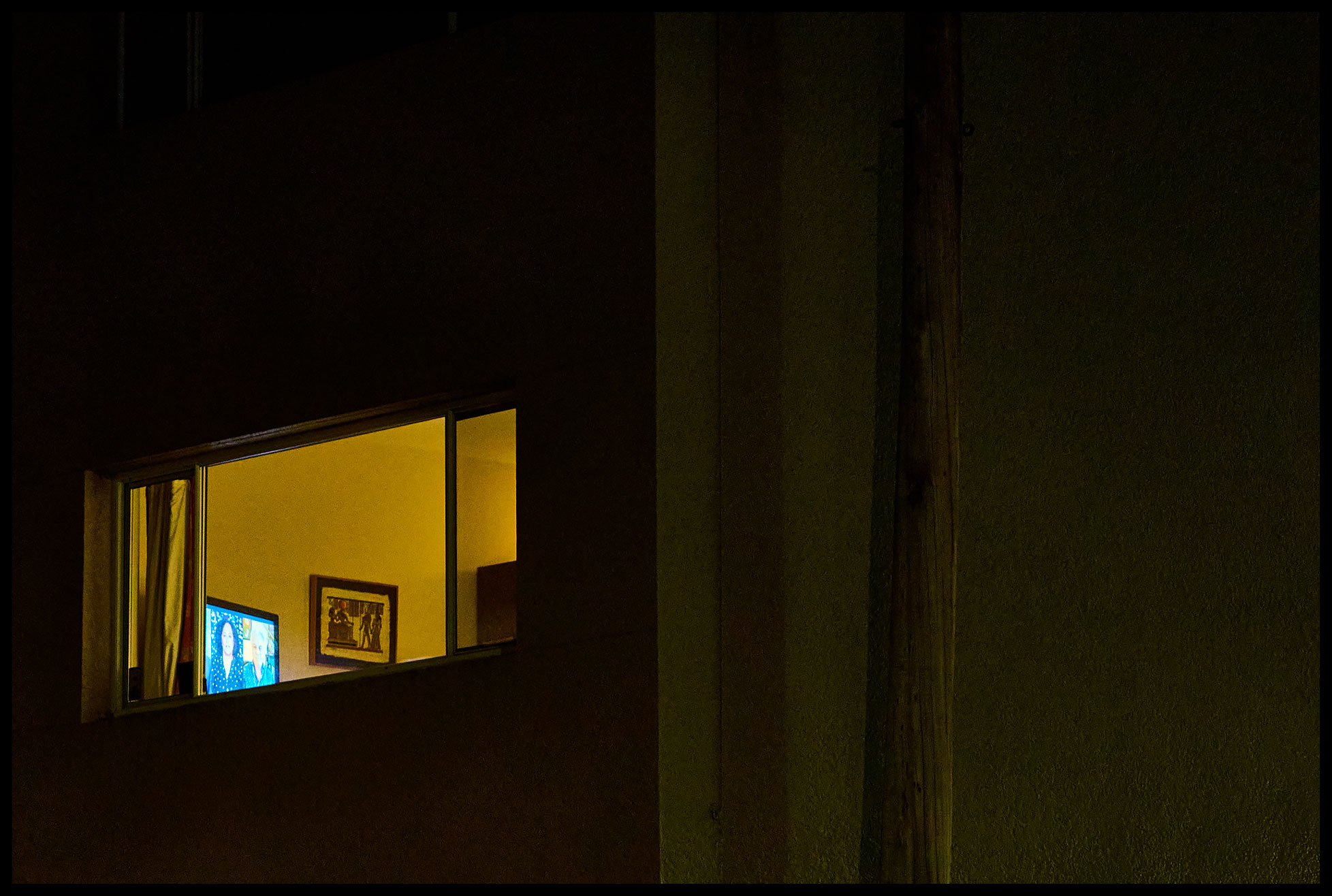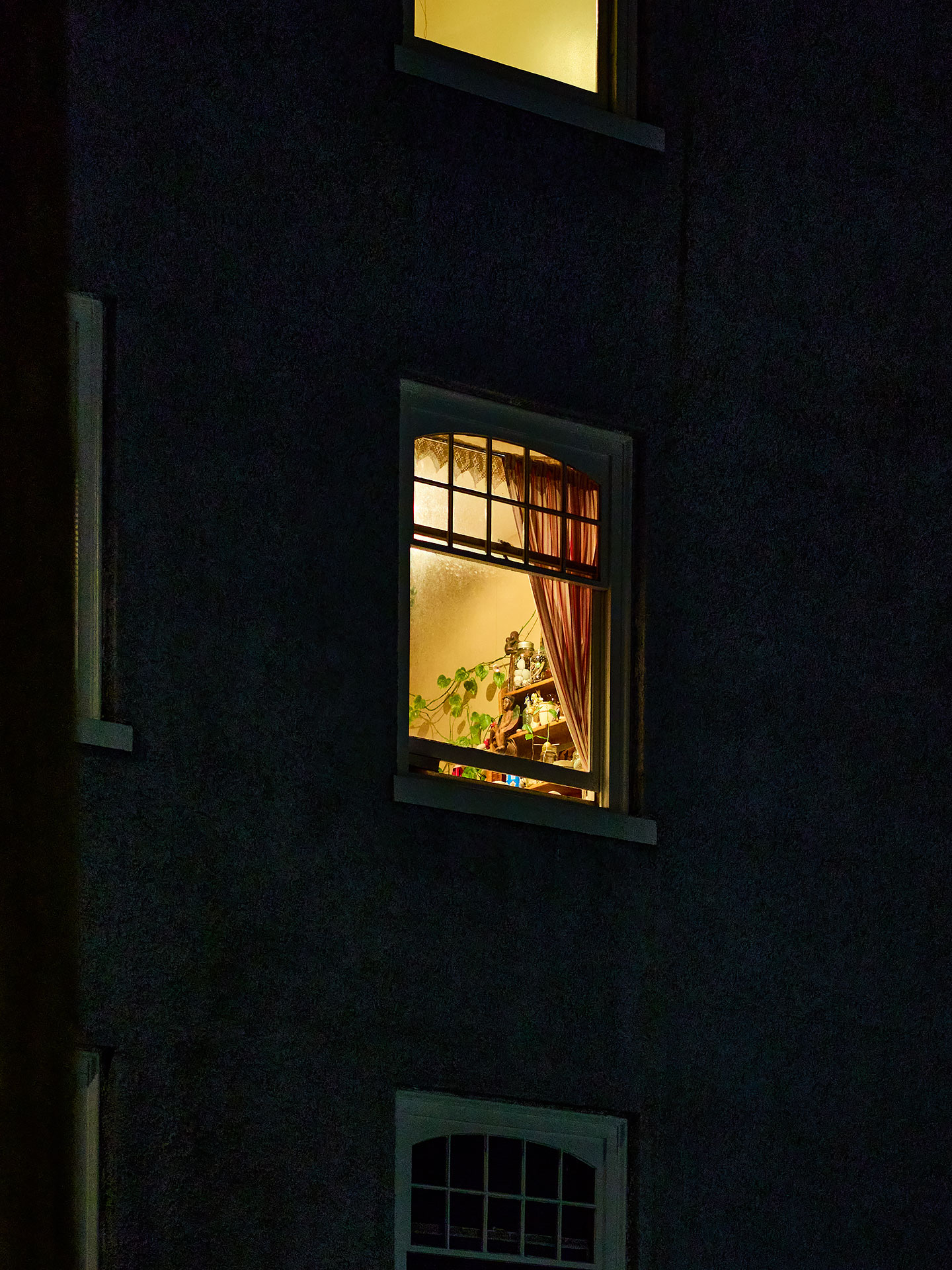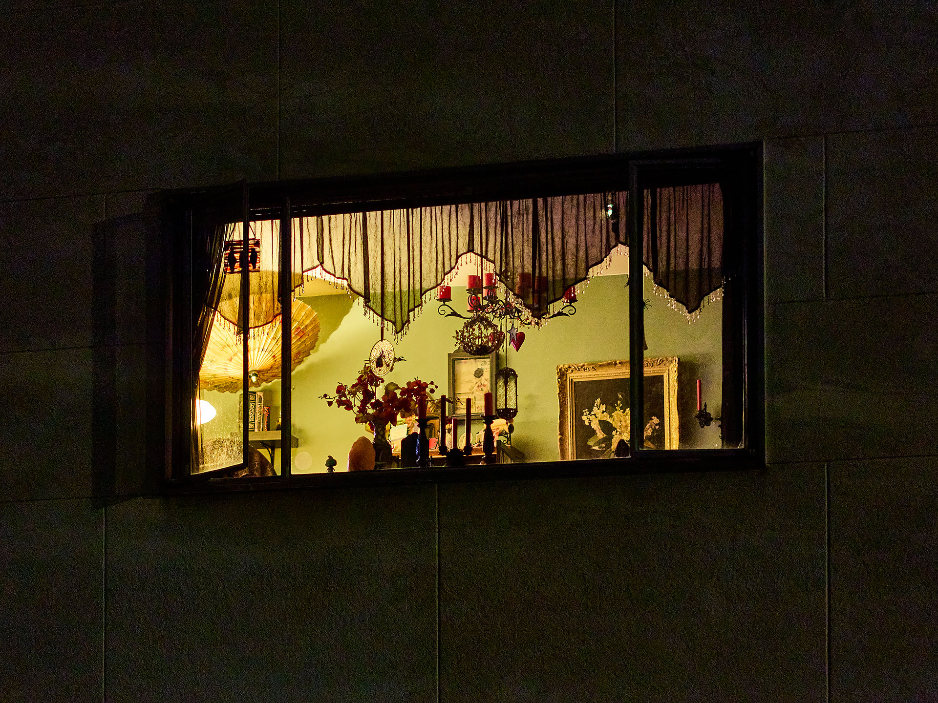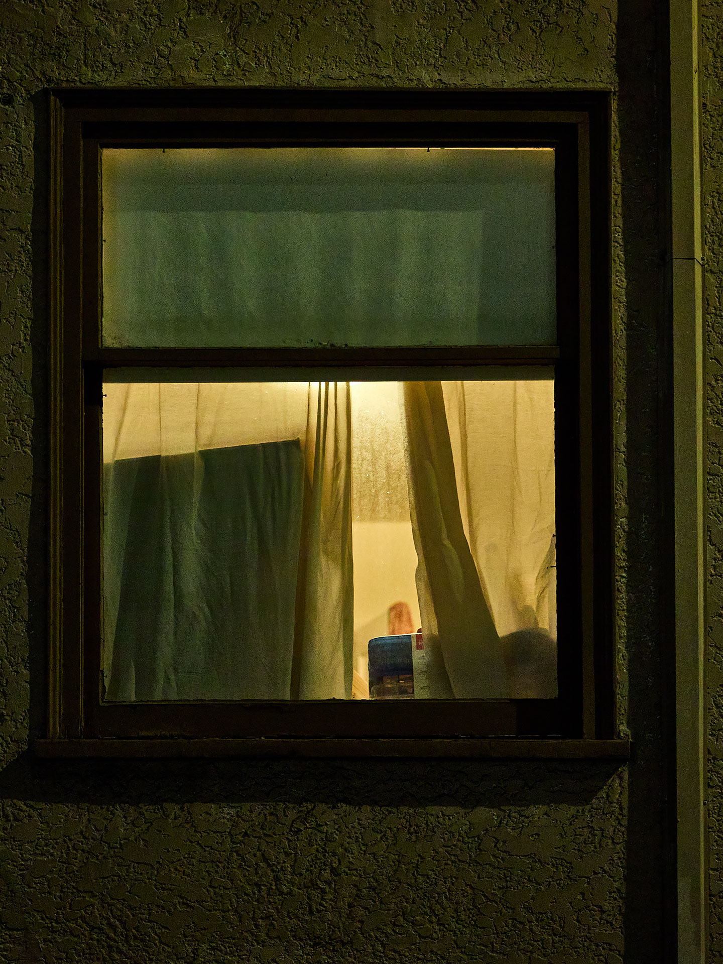 We all do it. We look in people’s windows as we walk down the street. Living in Vancouver’s West End neighbourhood – a neighbourhood of apartment buildings – you can’t help but look up at a lit window as you walk by. The act feels transgressive. But, from the sidewalk, the view is acute and you can’t actually see in. The frame of the window becomes an abstract parallelogram where only ceilings, light fixtures, tall plants, tall furniture, and window sill detritus present themselves to you. Your transgression is made innocent by the negation of real access.