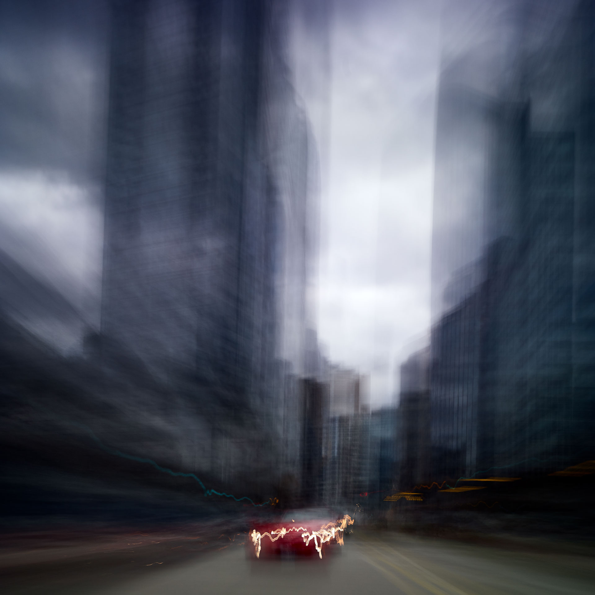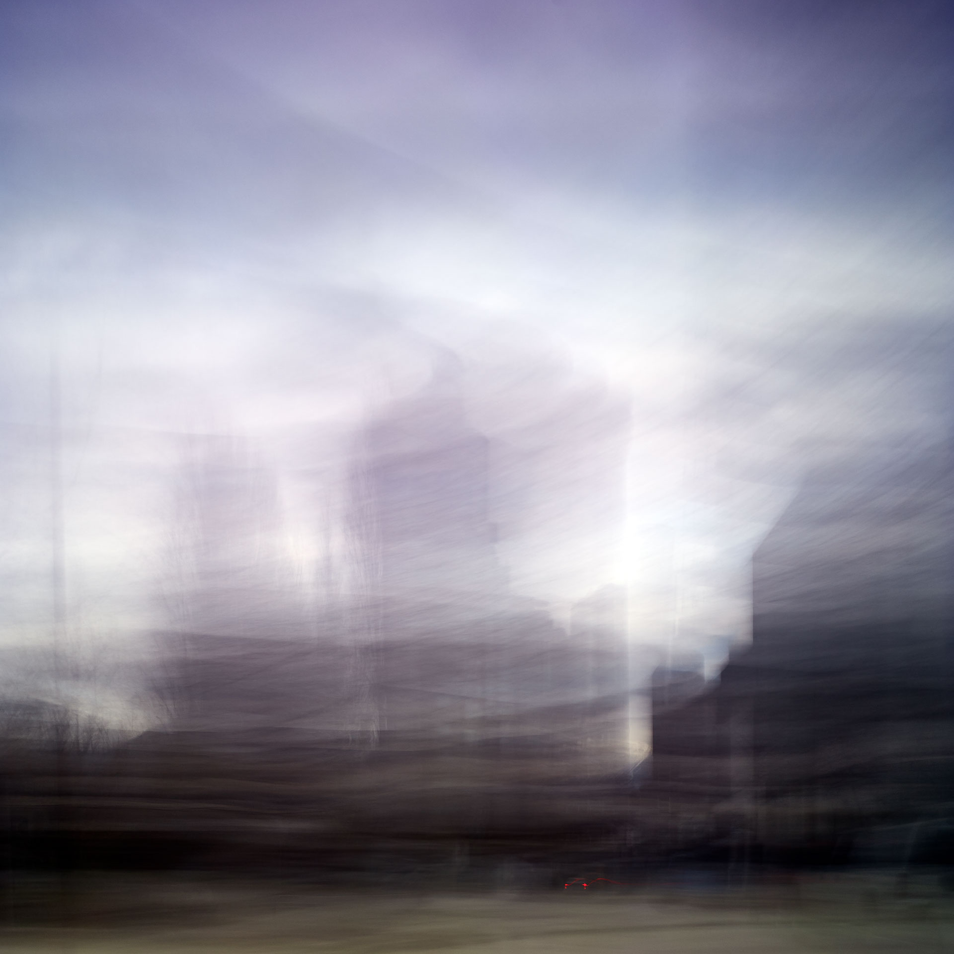 ‘Time Passages’ was shot both in 4×5 slide film, and in digital format. The film and the digital media offer different results; the digital is more ‘painterly’, while the film is more sublime. Both mediums capture the passing of time and the questioning of memory and lie somewhere between a short film and a multiple exposure, capturing superimposed vistas in the ‘Mountains’ series, creating new architecture through abstraction in the ‘Cities’ series, and expressing the sensation of movement in the ‘Trains’ series.