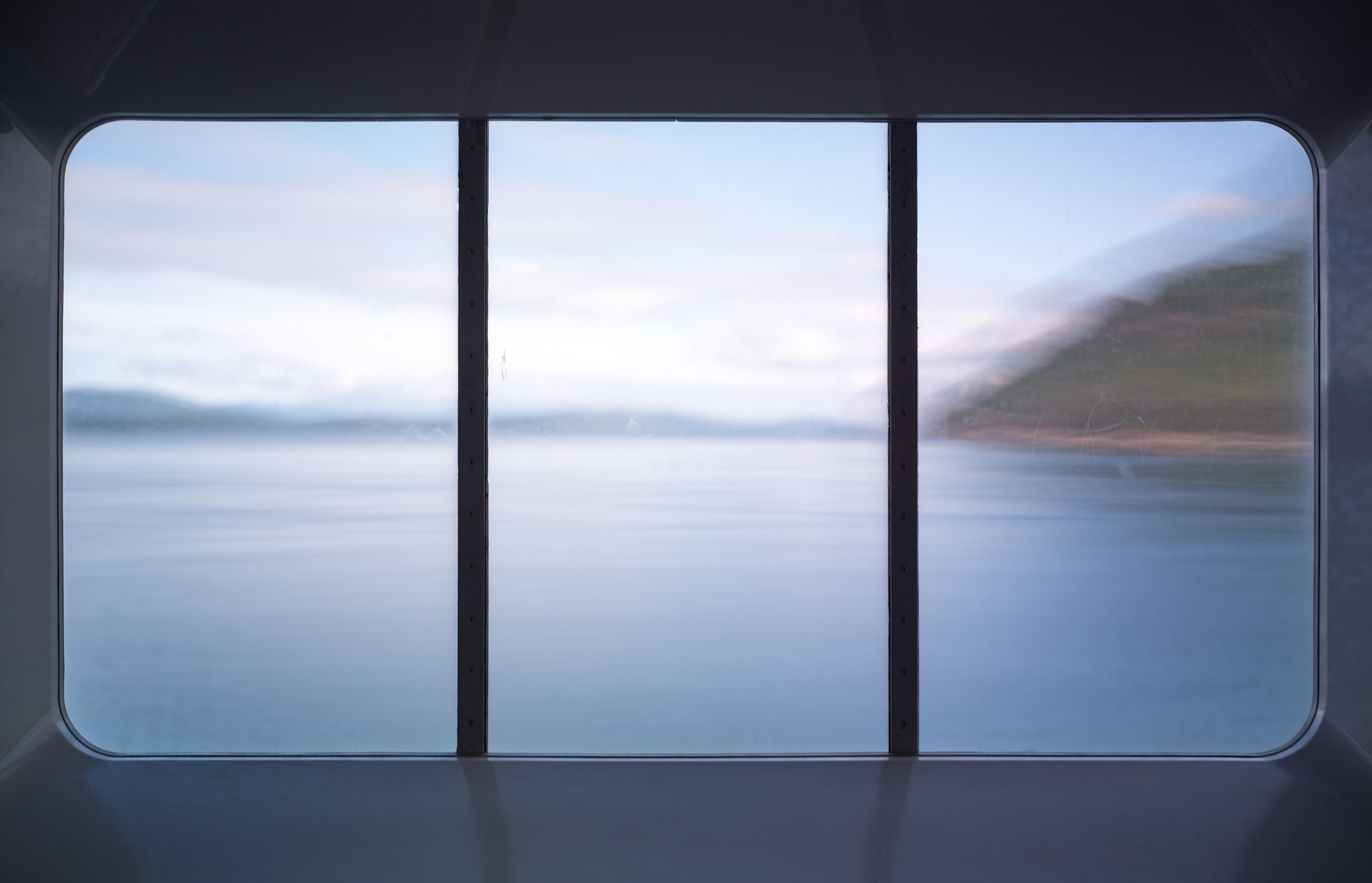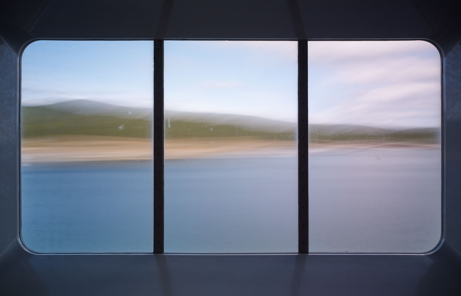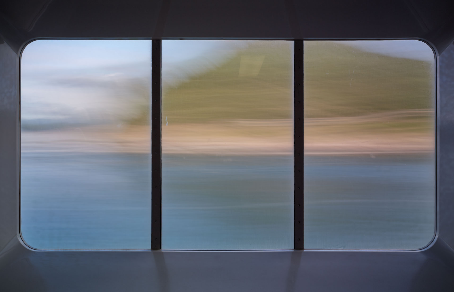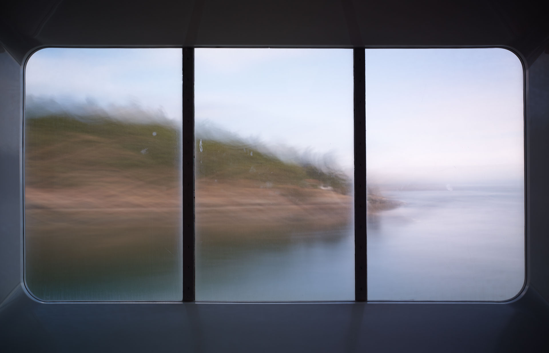 An extension of the ‘Time Passages’ collection – ‘Through the looking Glass’ brings the camera inside – shooting through the windows of the ferry, and using its frame, to create a cinematic experience for the viewer. The image begs the viewer to look into it, and at it, as the outside’ image through the window is an expression of the exterior surroundings, while the window itself is its own phenomenon, adding a texture of sea mist, scratches, and patina to the view. The frames of the window are reminiscent of a classic triptych / diptych.