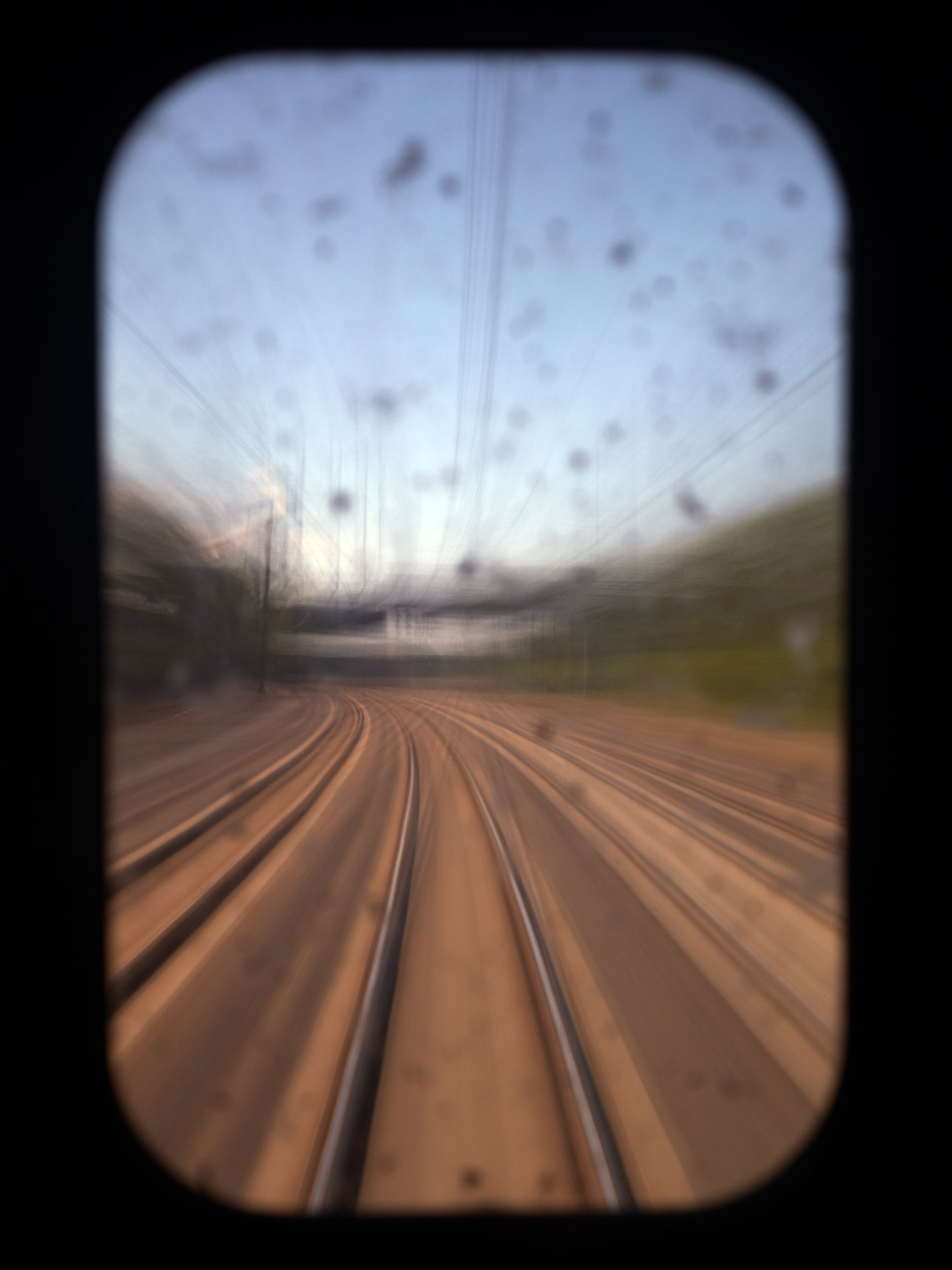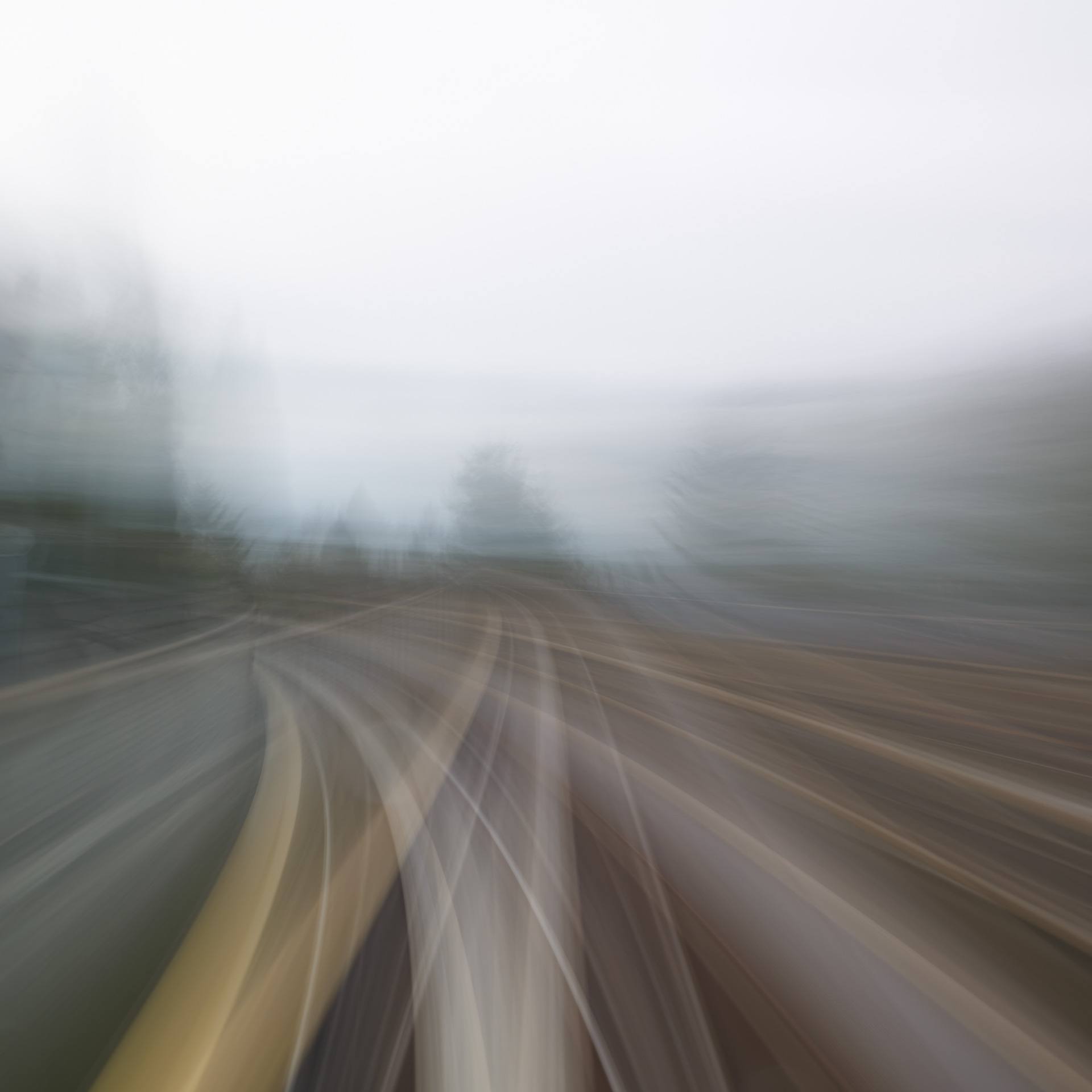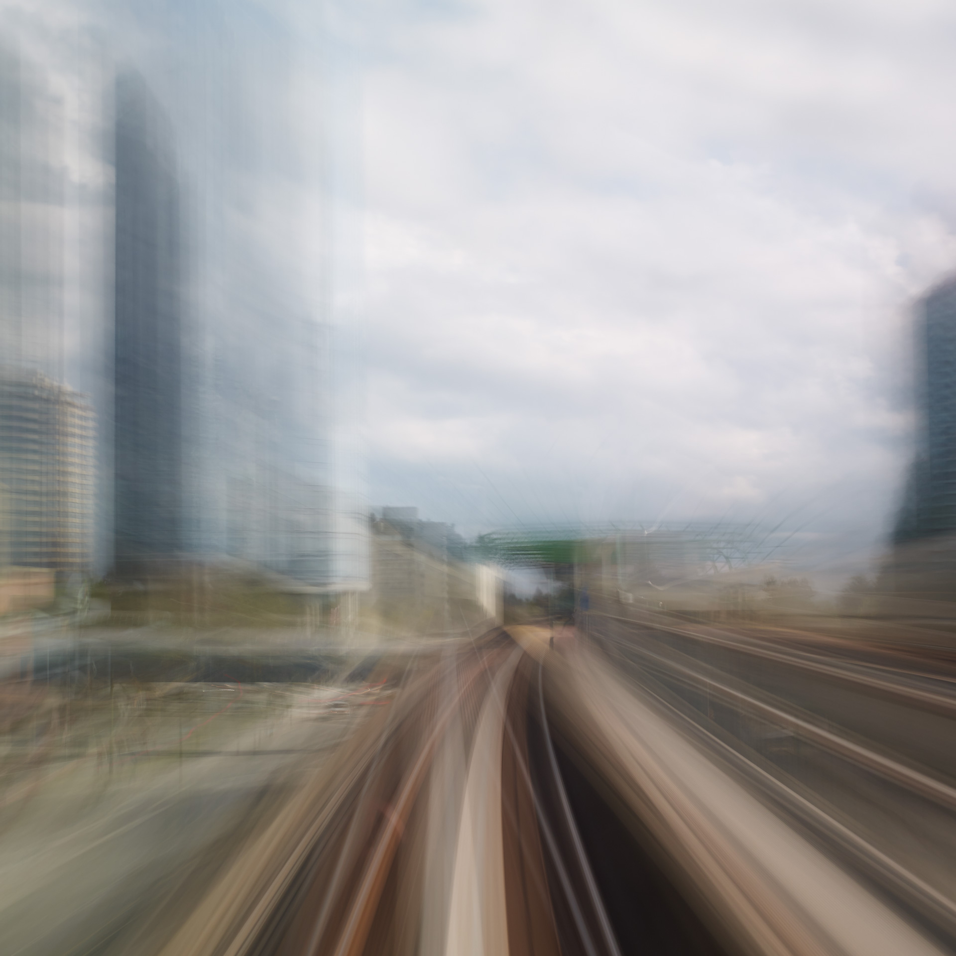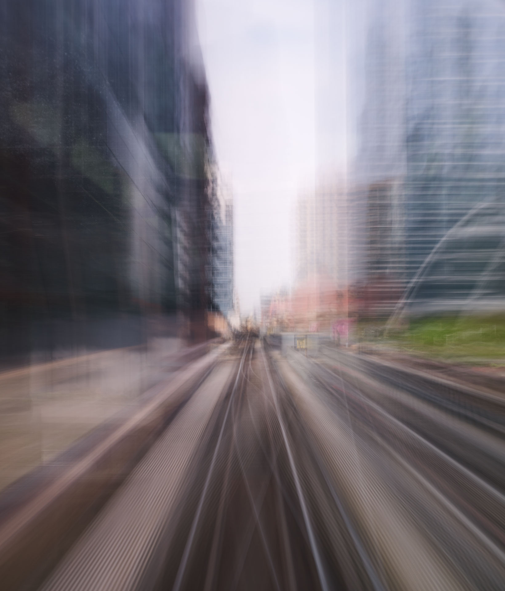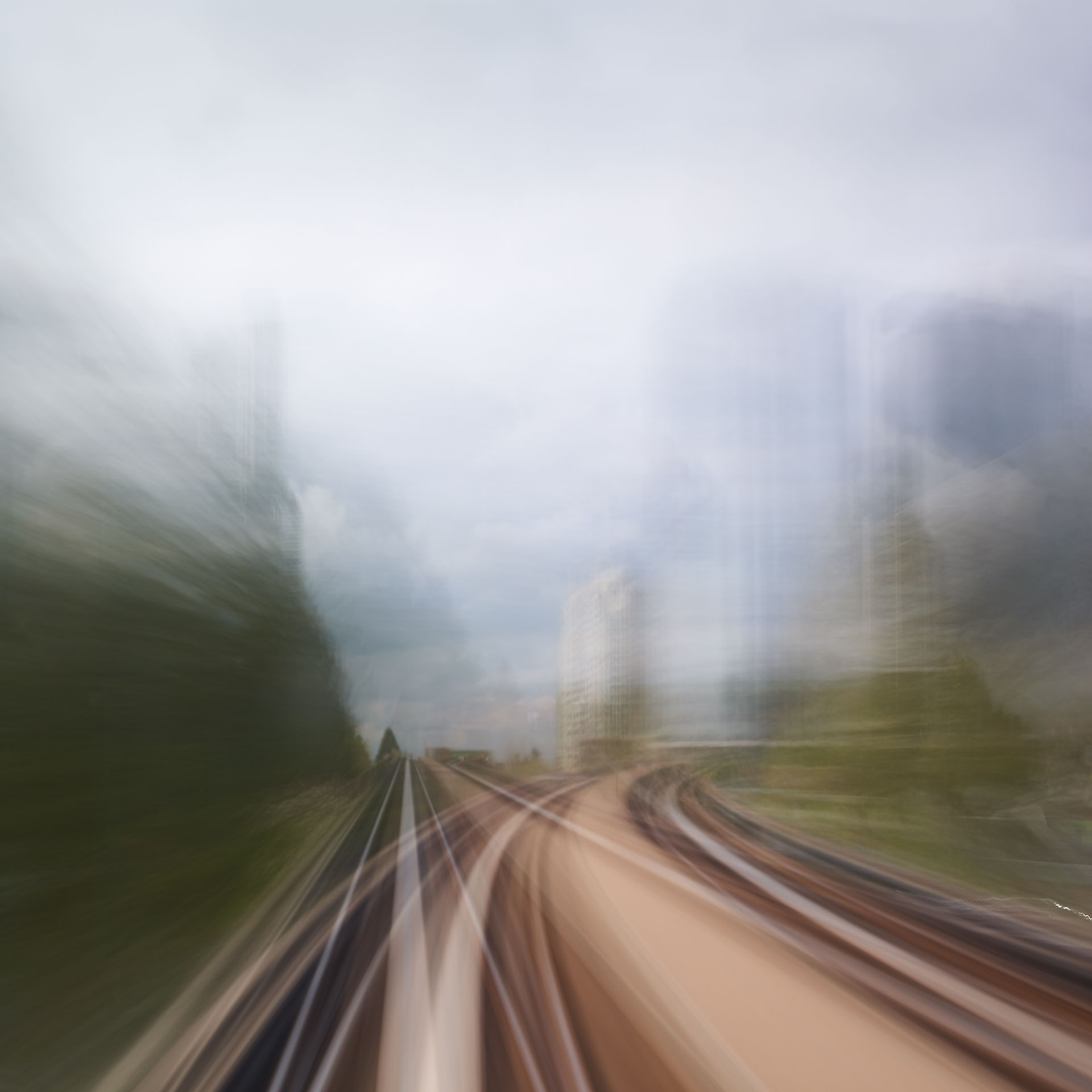 ‘Time Passages’ was shot both in 4×5 slide film, and in digital format. The film and the digital media offer different results; the digital is more ‘painterly’, while the film is more sublime. Both mediums capture the passing of time and the questioning of memory and lie somewhere between a short film and a multiple exposure, capturing superimposed vistas in the ‘Mountains’ series, creating new architecture through abstraction in the ‘Cities’ series, and expressing the sensation of movement in the ‘Trains’ series.