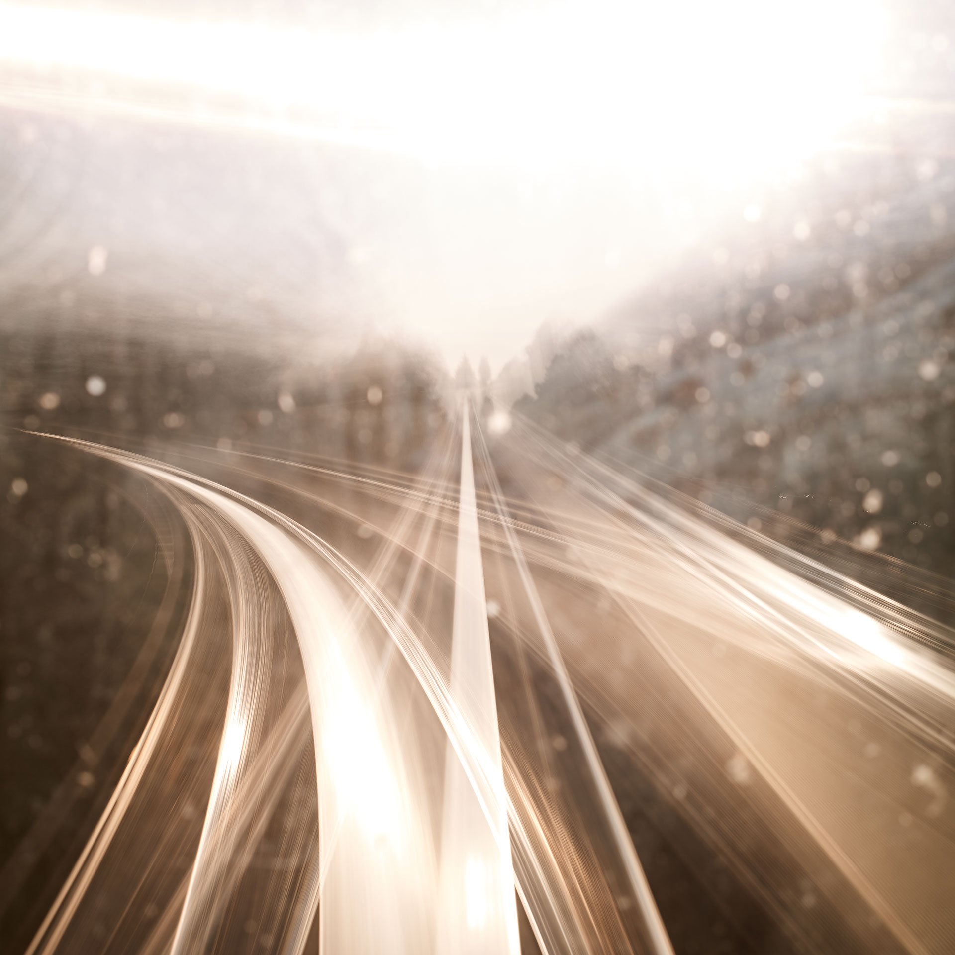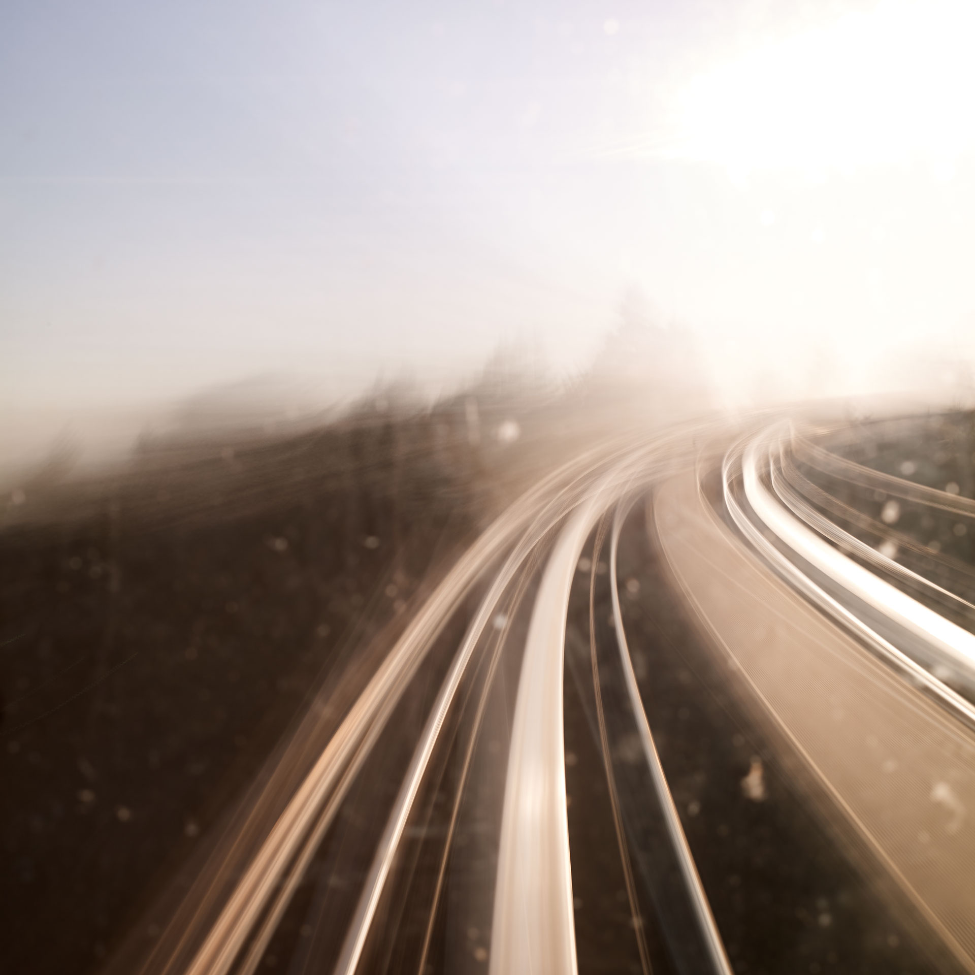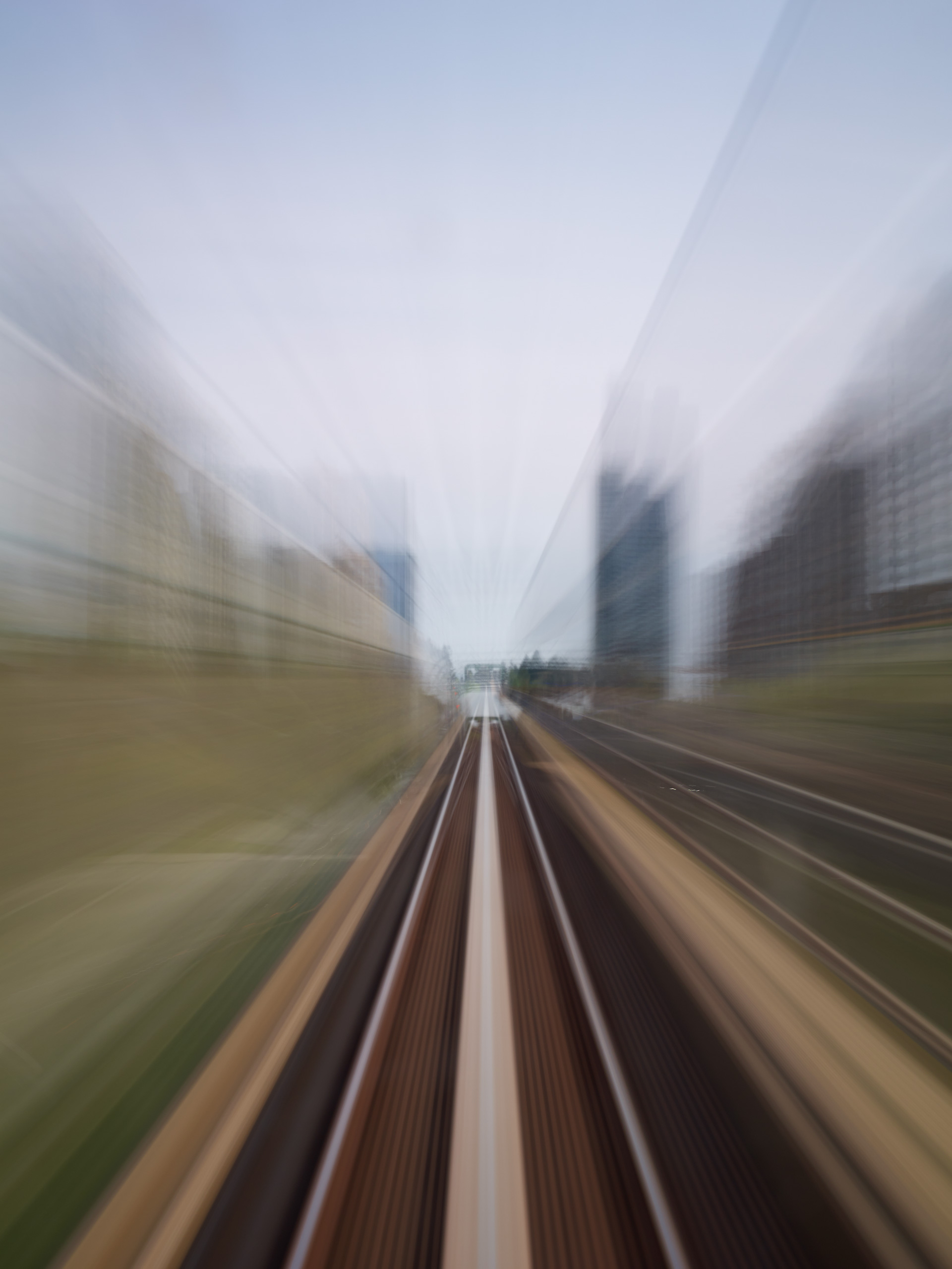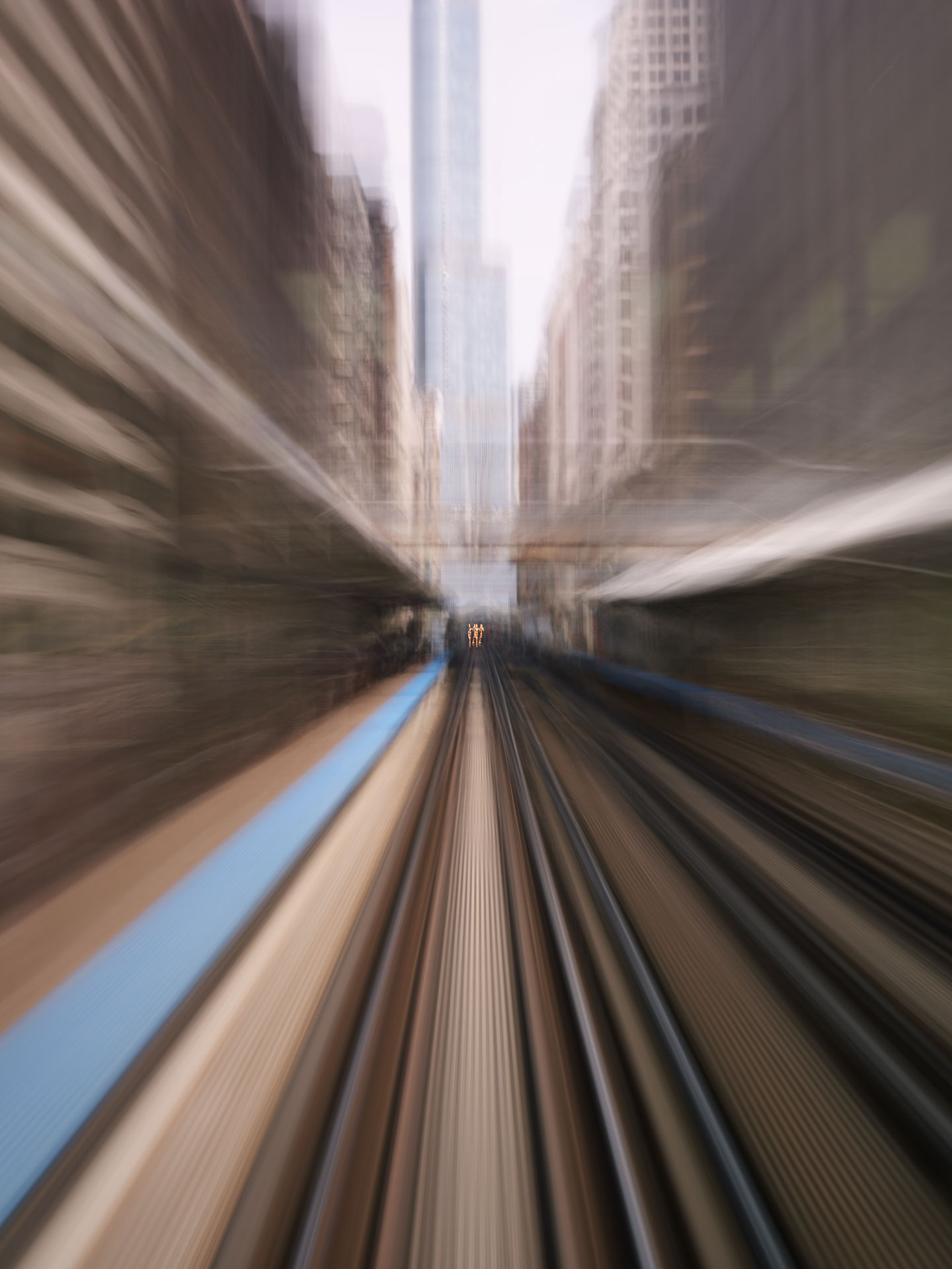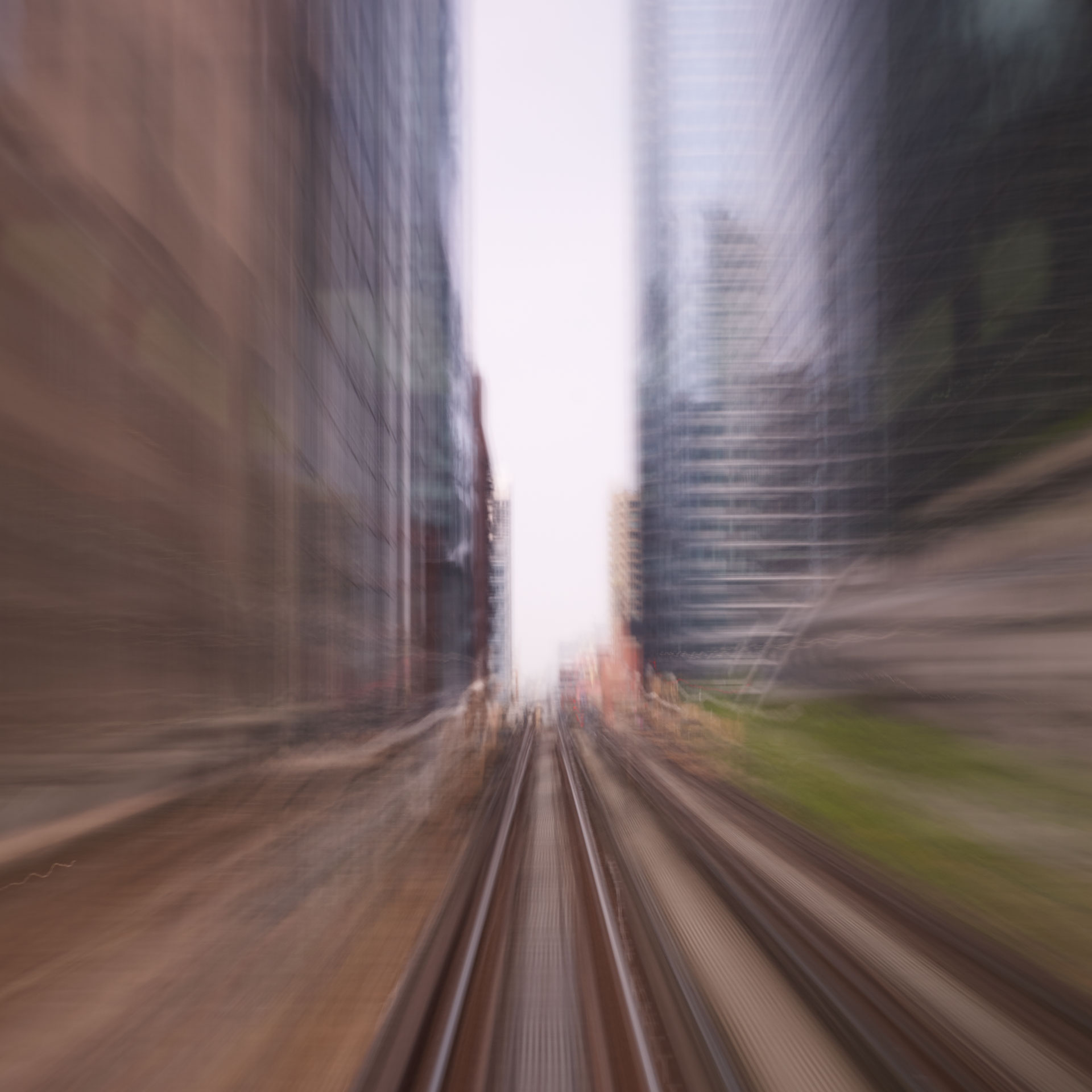 ‘Time Passages’ was shot both in 4×5 slide film, and in digital format. The film and the digital media offer different results; the digital is more ‘painterly’, while the film is more sublime. Both mediums capture the passing of time and the questioning of memory and lie somewhere between a short film and a multiple exposure, capturing superimposed vistas in the ‘Mountains’ series, creating new architecture through abstraction in the ‘Cities’ series, and expressing the sensation of movement in the ‘Trains’ series.