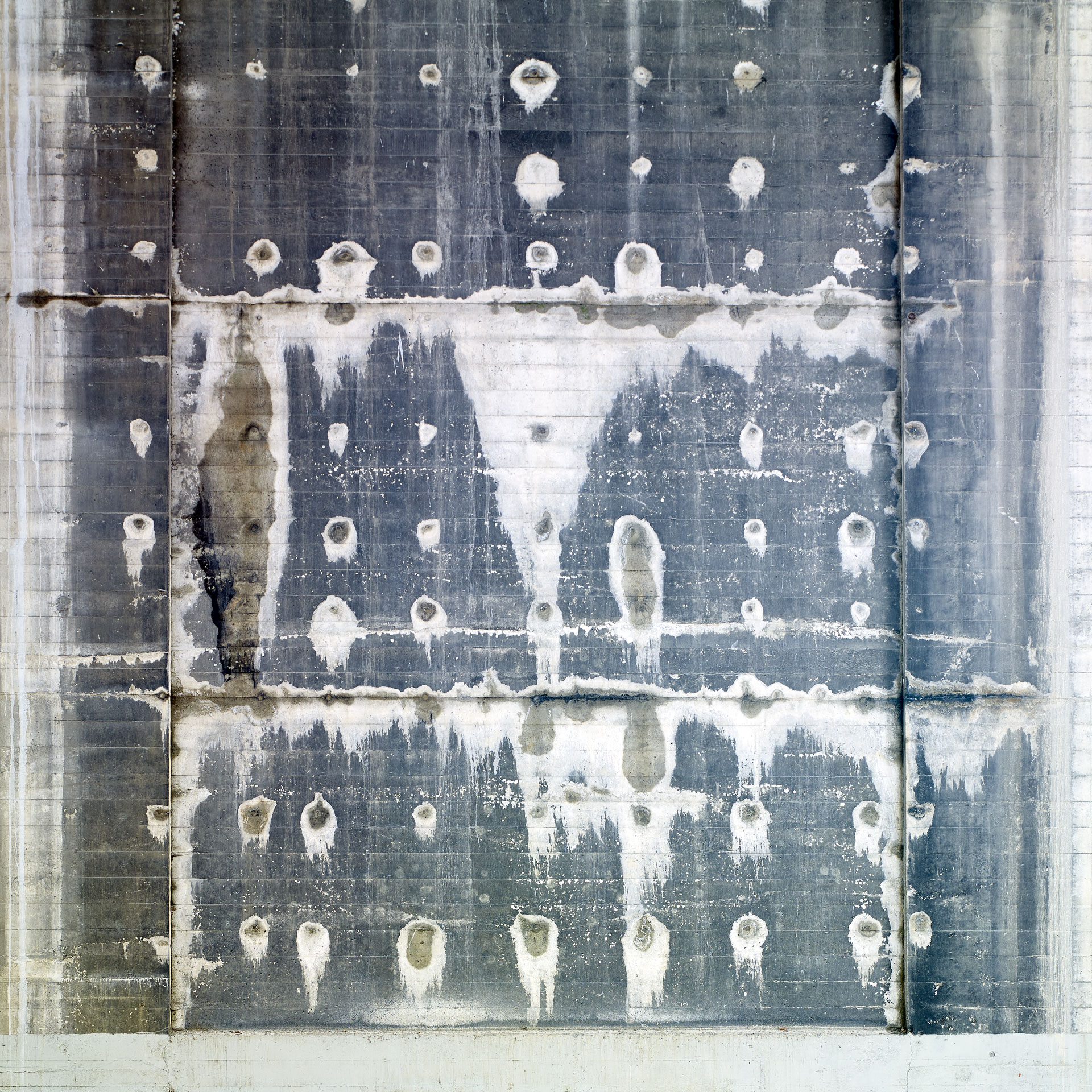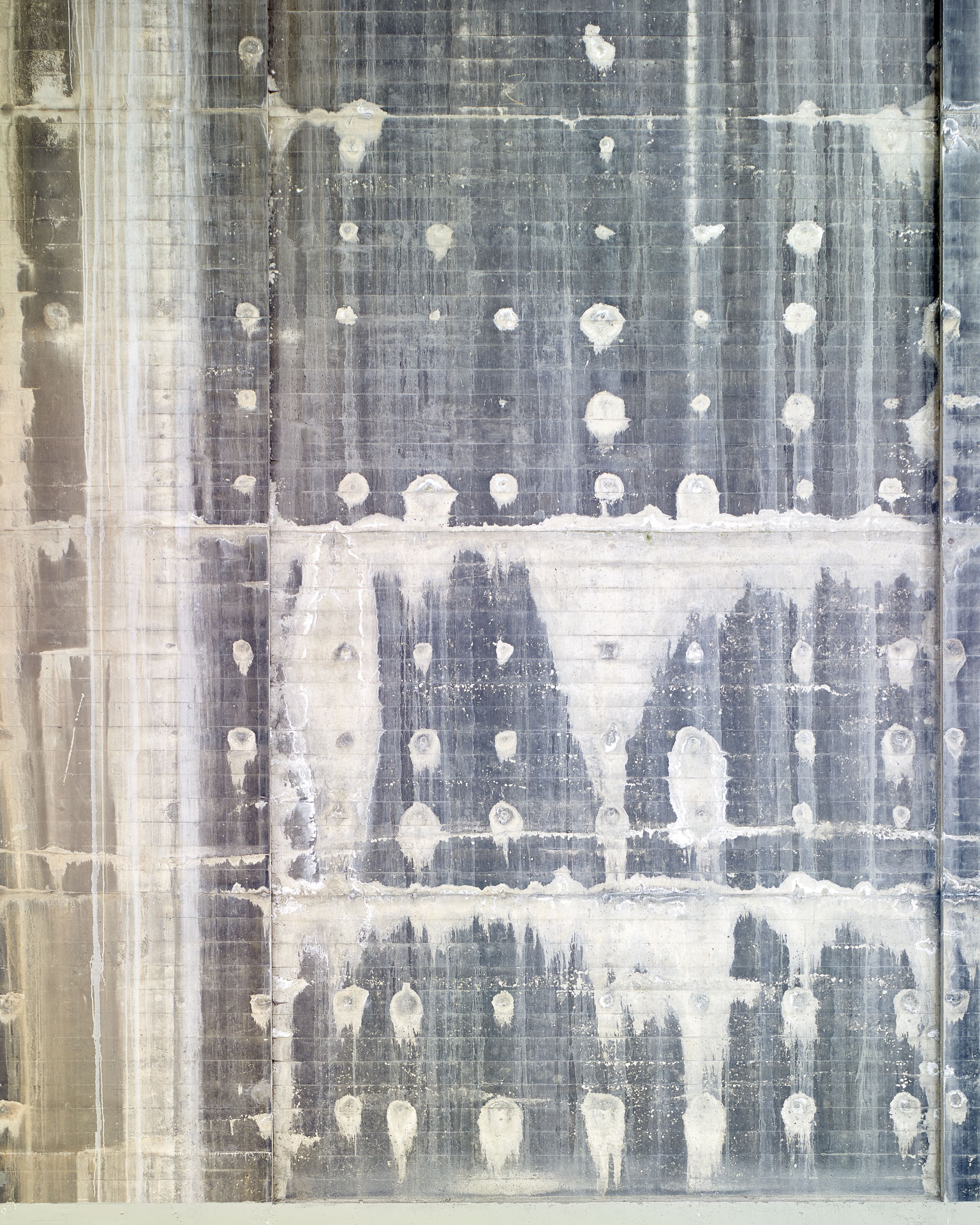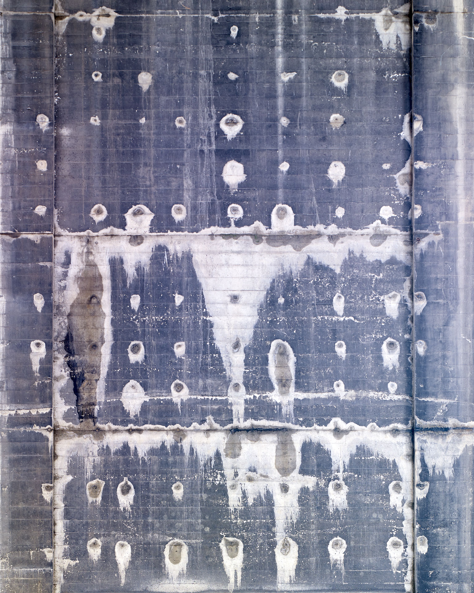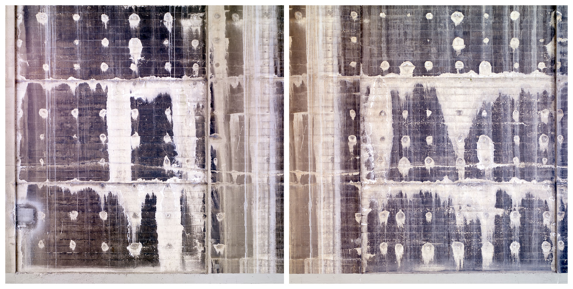 Over eighty-plus years, the concrete piers have effloresced, and scars of repair have appeared. The established right angles of the piers and the striations left by the wood slats of the concrete forms add a structure to what is essentially patterns of random weathering.