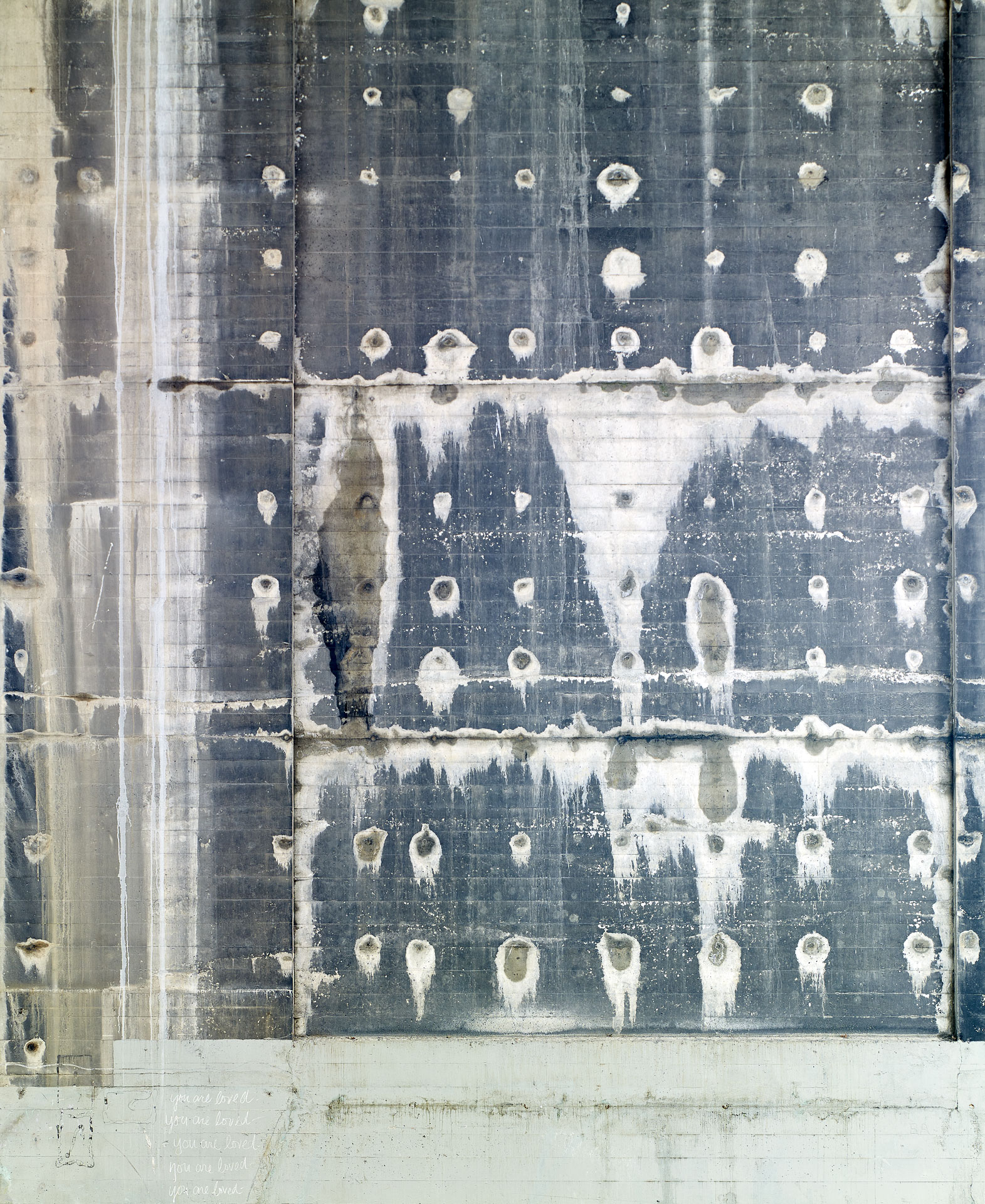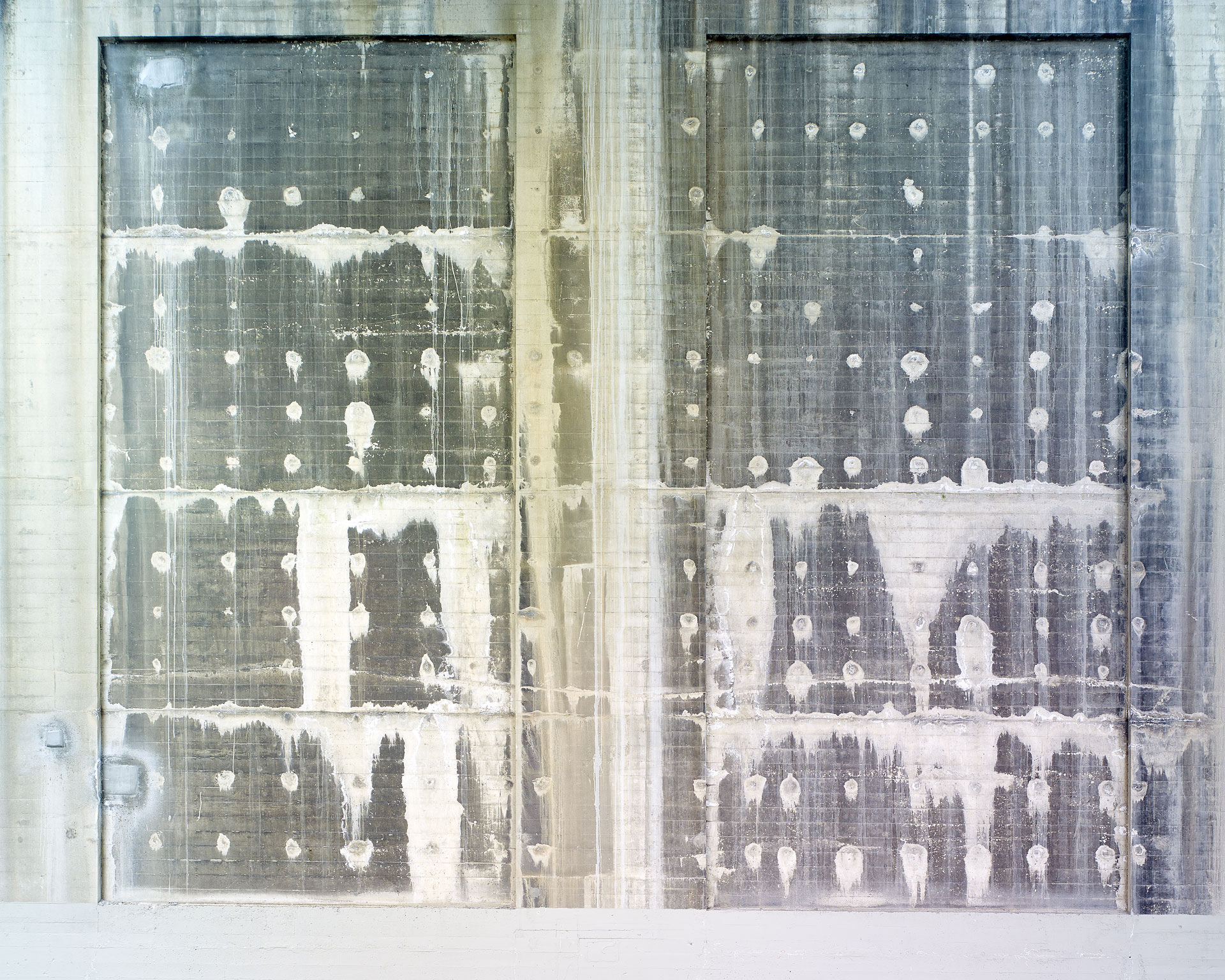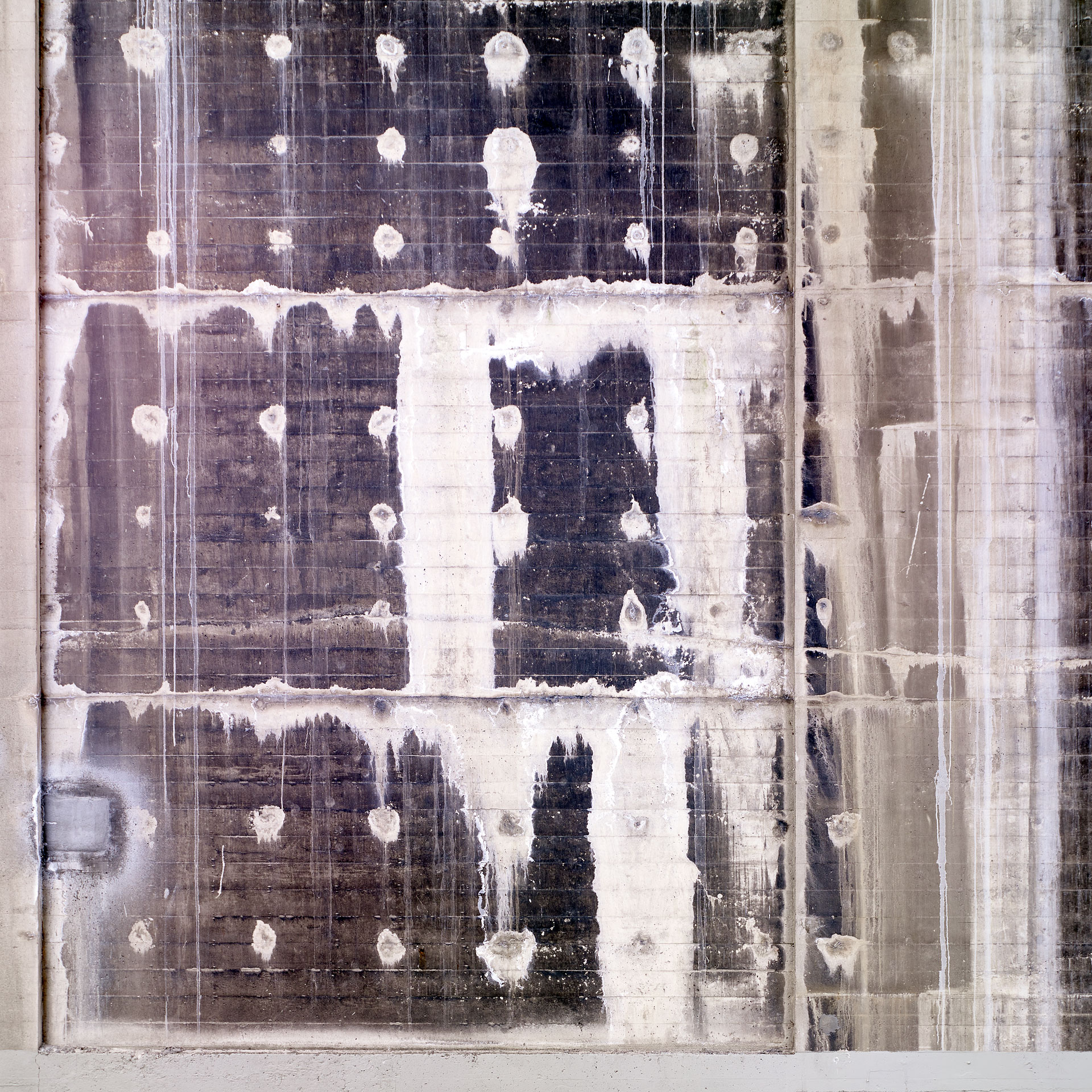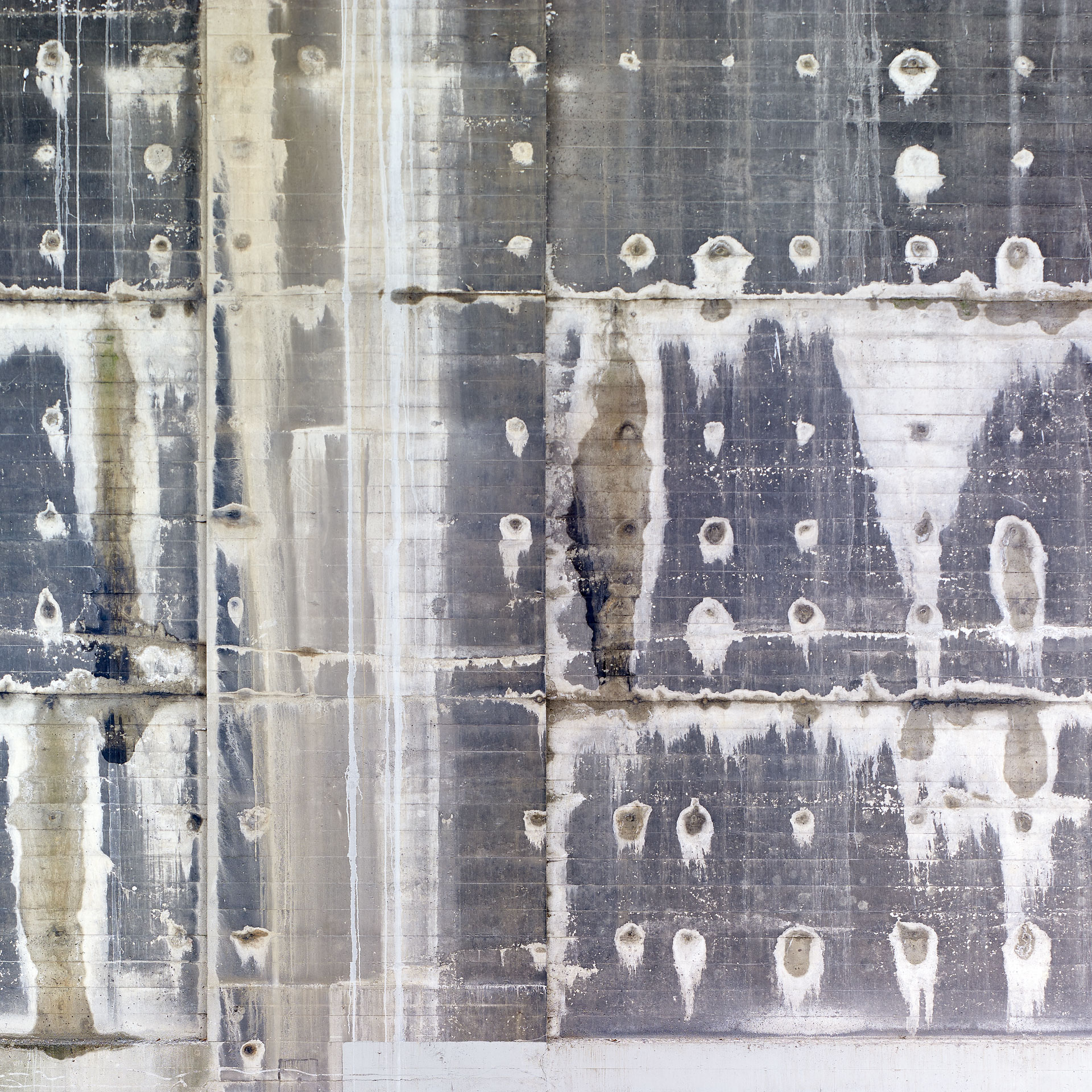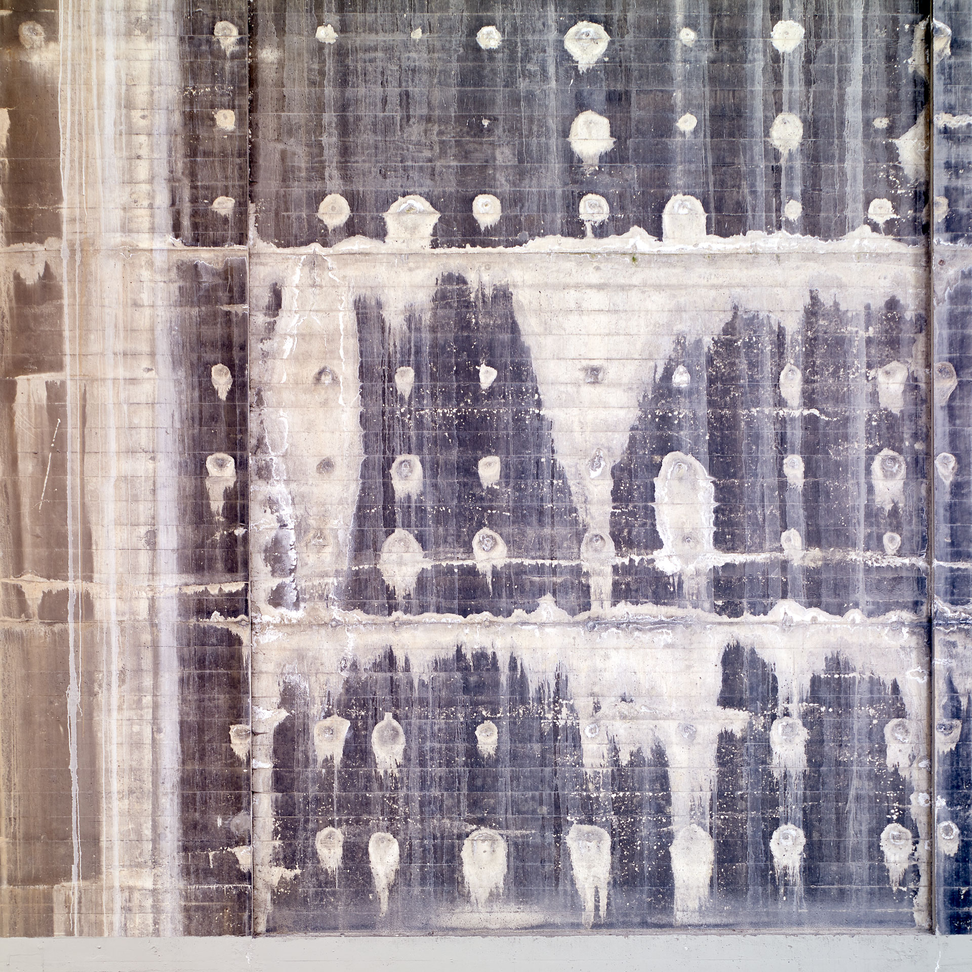 Over eighty-plus years, the concrete piers have effloresced, and scars of repair have appeared. The established right angles of the piers and the striations left by the wood slats of the concrete forms add a structure to what is essentially patterns of random weathering.